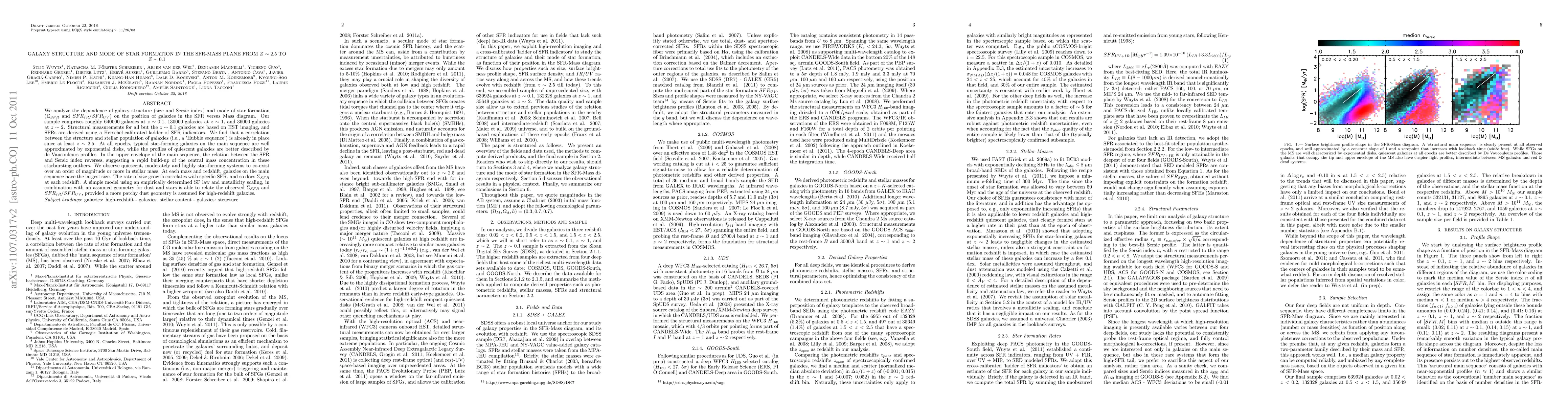 This paper investigates galaxy structure and star formation modes across redshifts z~2.5 to z~0.1, finding a correlation between galaxy structure and stellar population since at least z~2.5. It shows that star-forming galaxies on the main sequence have exponential disk profiles, while quiescent galaxies follow de Vaucouleurs profiles, with starburst outliers exhibiting rapid central mass concentration.