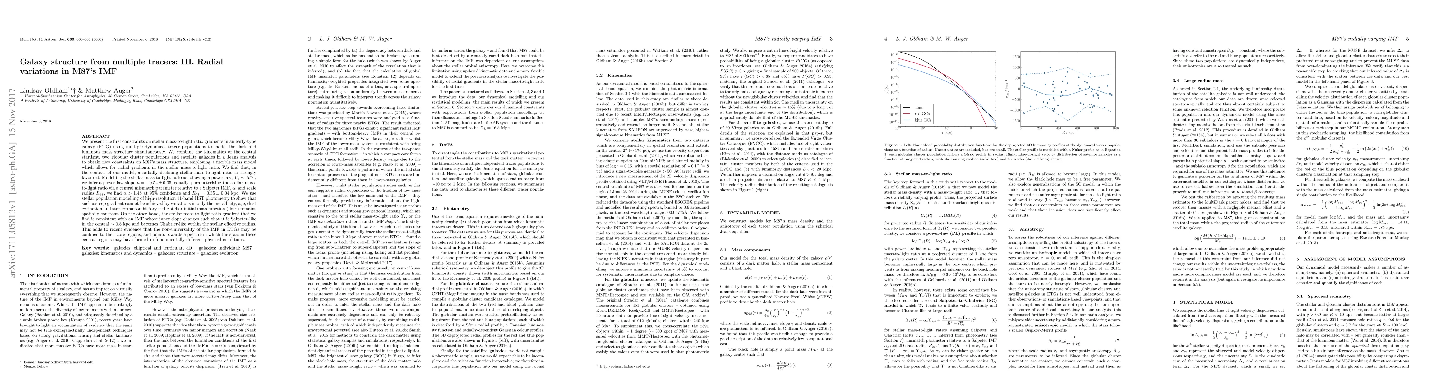 We present the first constraints on stellar mass-to-light ratio gradients in an early-type galaxy (ETG) using multiple dynamical tracer populations to model the dark and luminous mass structure simultaneously. We combine the kinematics of the central starlight, two globular cluster populations and satellite galaxies in a Jeans analysis to obtain new constraints on M87's mass structure, employing a flexible mass model which allows for radial gradients in the stellar mass-to-light ratio. We find that, in the context of our model, a radially declining stellar-mass-to-light ratio is strongly favoured. Modelling the stellar mass-to-light ratio as following a power law, $\Upsilon_{\star} \sim R^{-\mu}$, we infer a power-law slope $\mu = -0.54 \pm 0.05$; equally, parameterising the stellar-mass-to-light ratio via a central mismatch parameter relative to a Salpeter IMF, $\alpha$, and scale radius $R_M$, we find $\alpha > 1.48$ at $95\%$ confidence and $R_M = 0.35 \pm 0.04$ kpc. We use stellar population modelling of high-resolution 11-band HST photometry to show that such a steep gradient cannot be achieved by variations in only the metallicity, age, dust extinction and star formation history if the stellar initial mass function (IMF) remains spatially constant. On the other hand, the stellar mass-to-light ratio gradient that we find is consistent with an IMF whose inner slope changes such that it is Salpeter-like in the central $\sim 0.5$ kpc and becomes Chabrier-like within the stellar effective radius. This adds to recent evidence that the non-universality of the IMF in ETGs may be confined to their core regions, and points towards a picture in which the stars in these central regions may have formed in fundamentally different physical conditions.