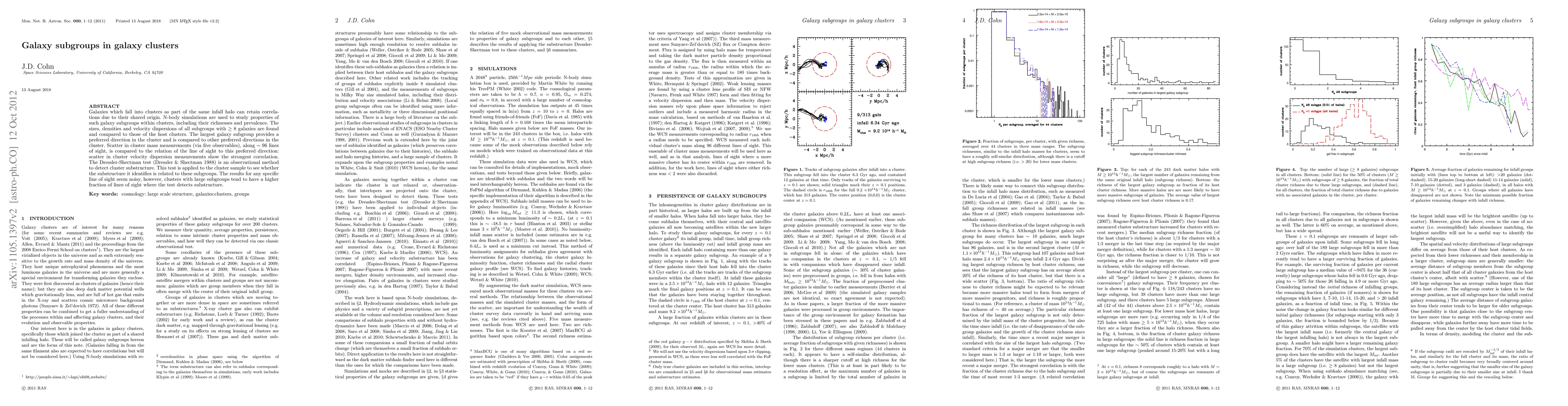 Galaxies which fall into clusters as part of the same infall halo can retain correlations due to their shared origin. N-body simulations are used to study properties of such galaxy subgroups within clusters, including their richnesses and prevalence. The sizes, densities and velocity dispersions of all subgroups with >= 8 galaxies are found and compared to those of the host clusters. The largest galaxy subgroup provides a preferred direction in the cluster and is compared to other preferred directions in the cluster. Scatter in cluster mass measurements (via five observables), along ~ 96 lines of sight, is compared to the relation of the line of sight to this preferred direction: scatter in cluster velocity dispersion measurements show the strongest correlation. The Dressler-Shectman test (Dressler & Shectman 1988), is applied to these clusters, to see whether the substructure it identifies is related to these subgroups. The results for any specific line of sight seem noisy; however, clusters with large subgroups tend to have a higher fraction of lines of sight where the test detects substructure.