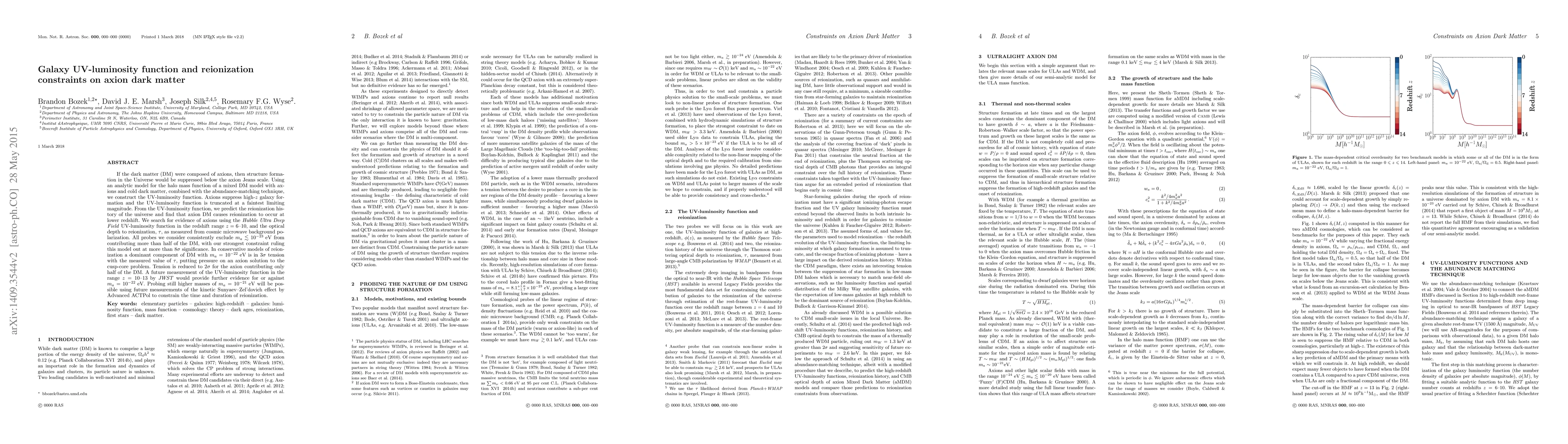 If the dark matter (DM) were composed of axions, then structure formation in the Universe would be suppressed below the axion Jeans scale. Using an analytic model for the halo mass function of a mixed DM model with axions and cold dark matter, combined with the abundance-matching technique, we construct the UV-luminosity function. Axions suppress high-$z$ galaxy formation and the UV-luminosity function is truncated at a faintest limiting magnitude. From the UV-luminosity function, we predict the reionization history of the universe and find that axion DM causes reionization to occur at lower redshift. We search for evidence of axions using the Hubble Ultra Deep Field UV-luminosity function in the redshift range $z=6$-$10$, and the optical depth to reionization, $\tau$, as measured from cosmic microwave background polarization. All probes we consider consistently exclude $m_a\lesssim 10^{-23}\text{ eV}$ from contributing more than half of the DM, with our strongest constraint ruling this model out at more than $8\sigma$ significance. In conservative models of reionization a dominant component of DM with $m_a=10^{-22}\text{ eV}$ is in $3\sigma$ tension with the measured value of $\tau$, putting pressure on an axion solution to the cusp-core problem. Tension is reduced to $2\sigma$ for the axion contributing only half of the DM. A future measurement of the UV-luminosity function in the range $z=10$-$13$ by JWST would provide further evidence for or against $m_a=10^{-22}\text{ eV}$. Probing still higher masses of $m_a=10^{-21}\text{ eV}$ will be possible using future measurements of the kinetic Sunyaev-Zel'dovich effect by Advanced ACTPol to constrain the time and duration of reionization.