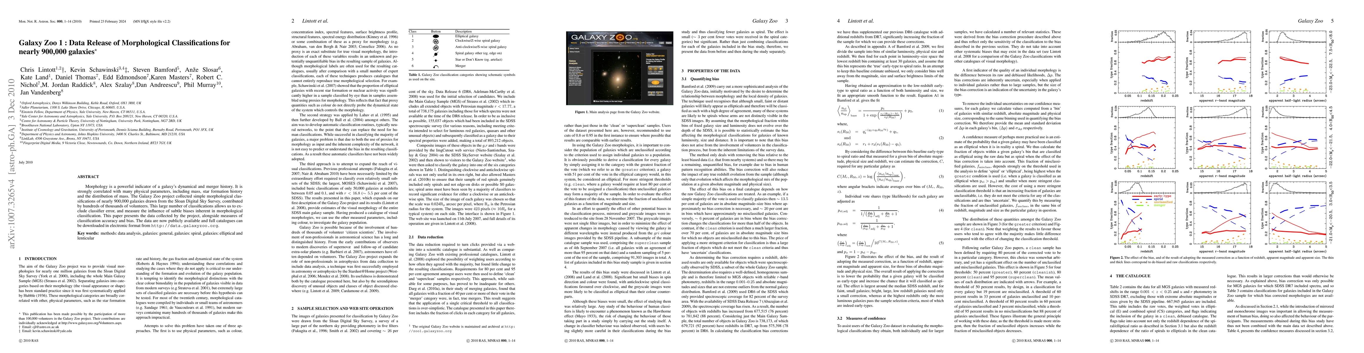 The Galaxy Zoo project has released a dataset of nearly 900,000 galaxy morphological classifications from the Sloan Digital Sky Survey, contributed by volunteers, providing insights into galaxy dynamics and biases in classification. The data, now publicly available, includes measures of accuracy and bias.
