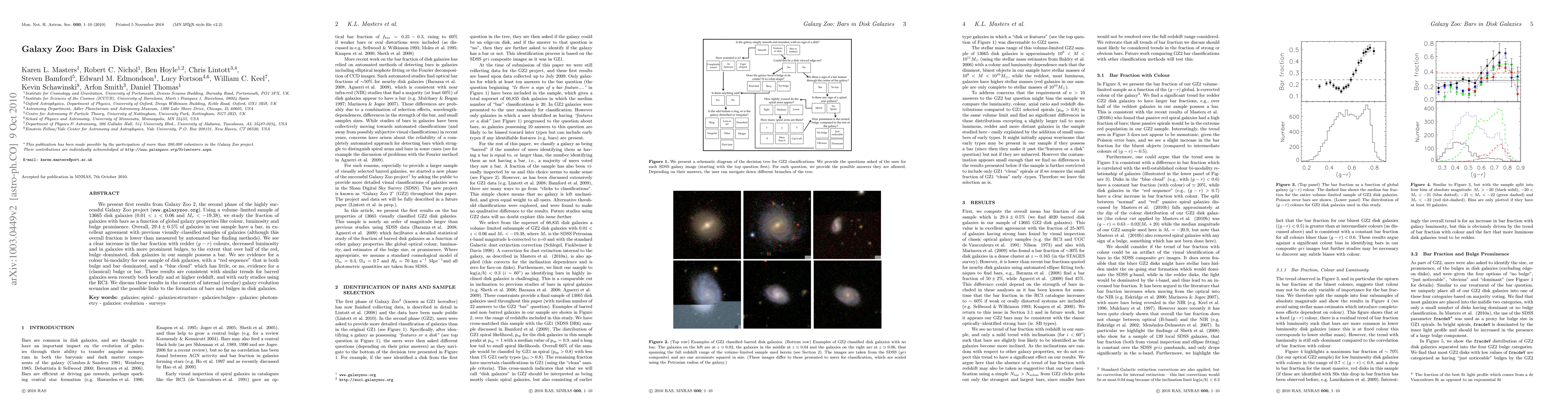 This paper from Galaxy Zoo 2 finds that 29.4% of disk galaxies in a volume-limited sample exhibit bars, with a higher bar fraction in redder, less luminous, and bulge-prominent galaxies. The study reveals a color bi-modality, distinguishing a "red sequence" with bars and bulges from a "blue cloud" lacking these features.