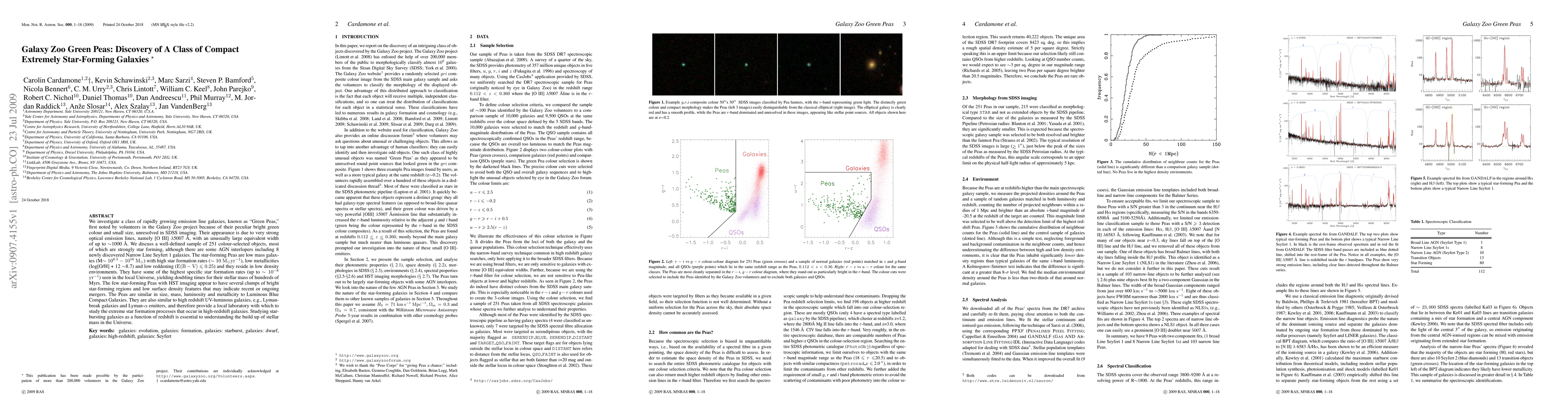 The paper presents a study of "Green Peas," compact, star-forming galaxies identified for their bright green color and strong [O III] emission lines. These low-mass galaxies exhibit high star formation rates and low metallicities, making them analogous to high-redshift star-forming galaxies.