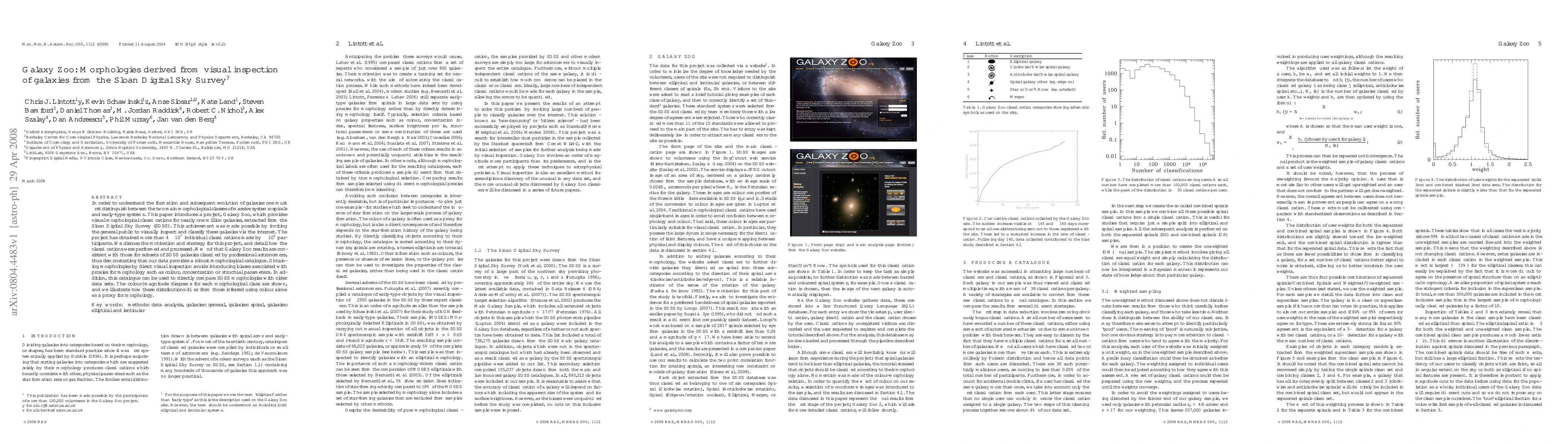 The Galaxy Zoo project visually classifies nearly one million galaxies from the Sloan Digital Sky Survey, leveraging public participation to achieve over 40 million classifications. This method provides a robust morphological catalogue, demonstrating consistency with professional classifications and avoiding biases from proxy measures.