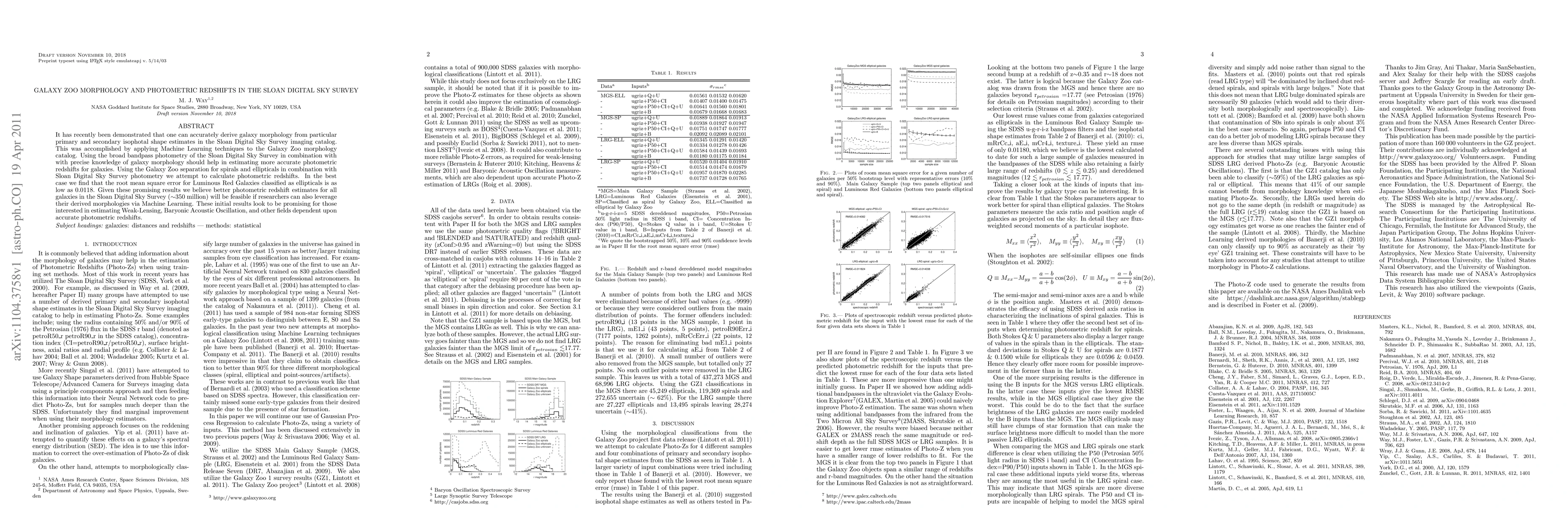 It has recently been demonstrated that one can accurately derive galaxy morphology from particular primary and secondary isophotal shape estimates in the Sloan Digital Sky Survey imaging catalog. This was accomplished by applying Machine Learning techniques to the Galaxy Zoo morphology catalog. Using the broad bandpass photometry of the Sloan Digital Sky Survey in combination with with precise knowledge of galaxy morphology should help in estimating more accurate photometric redshifts for galaxies. Using the Galaxy Zoo separation for spirals and ellipticals in combination with Sloan Digital Sky Survey photometry we attempt to calculate photometric redshifts. In the best case we find that the root mean square error for Luminous Red Galaxies classified as ellipticals is as low as 0.0118. Given these promising results we believe better photometric redshift estimates for all galaxies in the Sloan Digital Sky Survey ($\sim$350 million) will be feasible if researchers can also leverage their derived morphologies via Machine Learning. These initial results look to be promising for those interested in estimating Weak-Lensing, Baryonic Acoustic Oscillation, and other fields dependent upon accurate photometric redshifts.