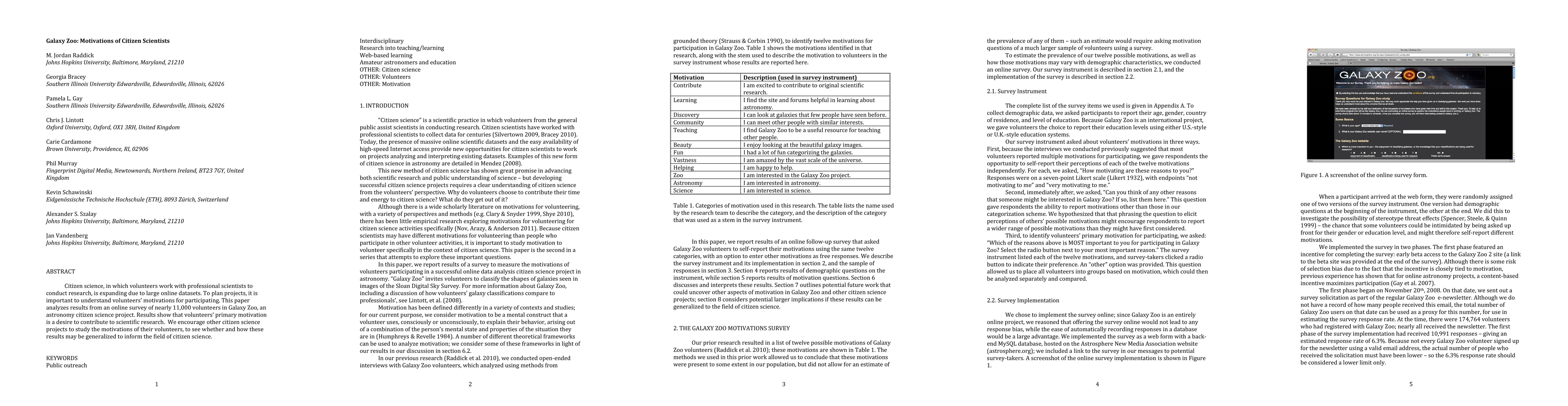 This paper analyzes motivations of nearly 11,000 volunteers in Galaxy Zoo, finding that the primary reason for participation is a desire to contribute to scientific research. The study encourages other citizen science projects to investigate their volunteers' motivations to inform the broader field.