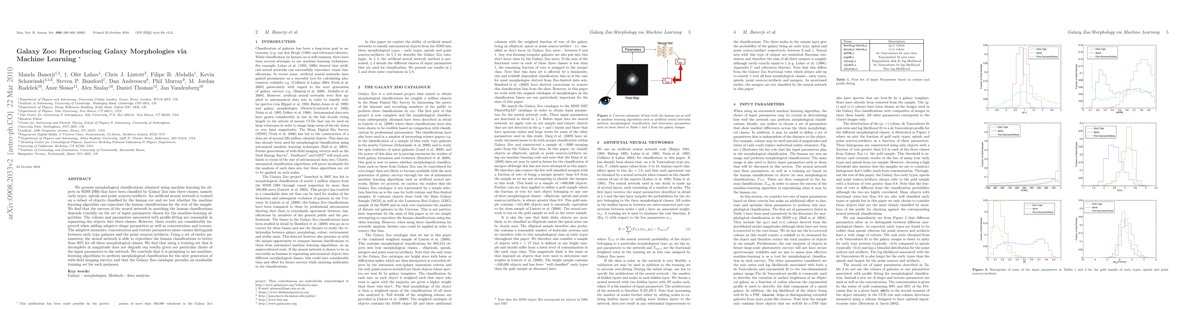 We present morphological classifications obtained using machine learning for objects in SDSS DR6 that have been classified by Galaxy Zoo into three classes, namely early types, spirals and point sources/artifacts. An artificial neural network is trained on a subset of objects classified by the human eye and we test whether the machine learning algorithm can reproduce the human classifications for the rest of the sample. We find that the success of the neural network in matching the human classifications depends crucially on the set of input parameters chosen for the machine-learning algorithm. The colours and parameters associated with profile-fitting are reasonable in separating the objects into three classes. However, these results are considerably improved when adding adaptive shape parameters as well as concentration and texture. The adaptive moments, concentration and texture parameters alone cannot distinguish between early type galaxies and the point sources/artifacts. Using a set of twelve parameters, the neural network is able to reproduce the human classifications to better than 90% for all three morphological classes. We find that using a training set that is incomplete in magnitude does not degrade our results given our particular choice of the input parameters to the network. We conclude that it is promising to use machine- learning algorithms to perform morphological classification for the next generation of wide-field imaging surveys and that the Galaxy Zoo catalogue provides an invaluable training set for such purposes.