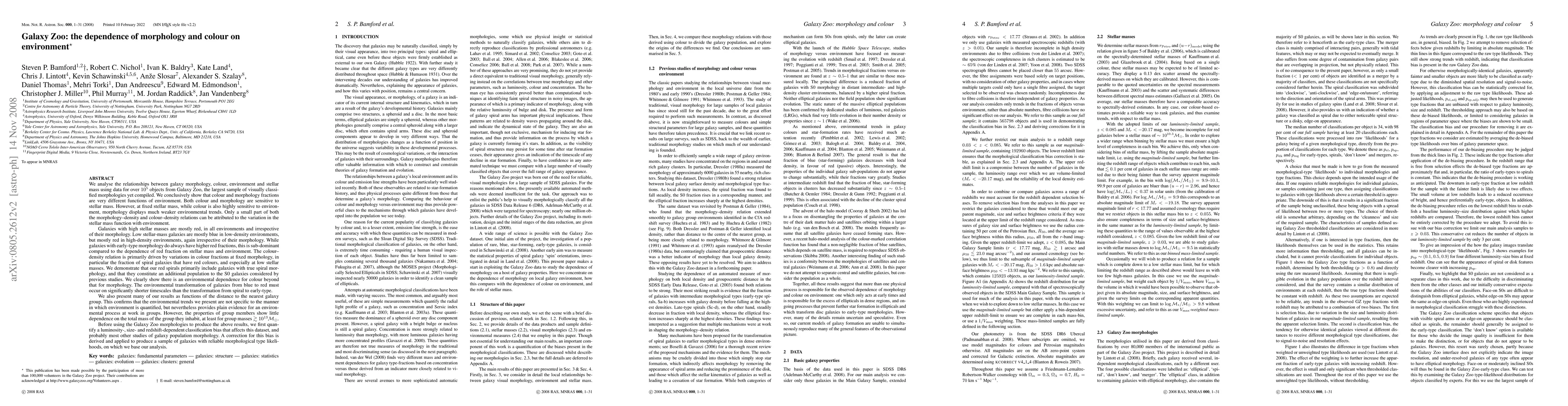 This paper analyzes over 100,000 galaxies from Galaxy Zoo to reveal that galaxy colour and morphology are strongly influenced by their environment, with colour showing a more pronounced environmental dependence than morphology. The study corrects for classification biases and finds that low-mass galaxies predominantly change colour from blue to red with increasing environmental density, while high-mass galaxies remain predominantly red regardless of their environment.