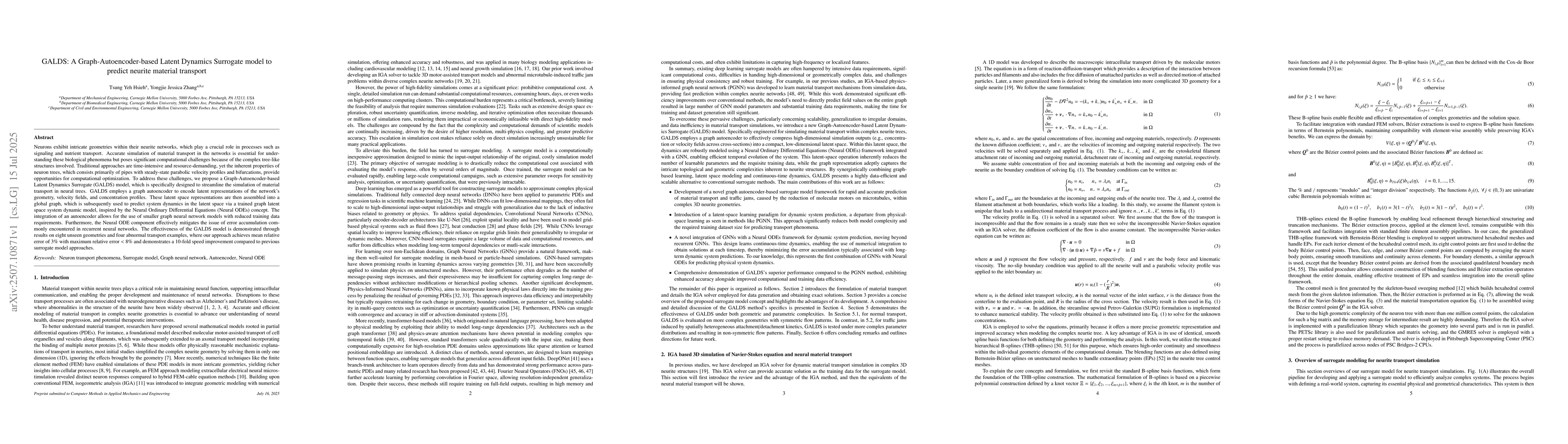 Neurons exhibit intricate geometries within their neurite networks, which play a crucial role in processes such as signaling and nutrient transport. Accurate simulation of material transport in the networks is essential for understanding these biological phenomena but poses significant computational challenges because of the complex tree-like structures involved. Traditional approaches are time-intensive and resource-demanding, yet the inherent properties of neuron trees, which consists primarily of pipes with steady-state parabolic velocity profiles and bifurcations, provide opportunities for computational optimization. To address these challenges, we propose a Graph-Autoencoder-based Latent Dynamics Surrogate (GALDS) model, which is specifically designed to streamline the simulation of material transport in neural trees. GALDS employs a graph autoencoder to encode latent representations of the network's geometry, velocity fields, and concentration profiles. These latent space representations are then assembled into a global graph, which is subsequently used to predict system dynamics in the latent space via a trained graph latent space system dynamic model, inspired by the Neural Ordinary Differential Equations (Neural ODEs) concept. The integration of an autoencoder allows for the use of smaller graph neural network models with reduced training data requirements. Furthermore, the Neural ODE component effectively mitigates the issue of error accumulation commonly encountered in recurrent neural networks. The effectiveness of the GALDS model is demonstrated through results on eight unseen geometries and four abnormal transport examples, where our approach achieves mean relative error of 3% with maximum relative error <8% and demonstrates a 10-fold speed improvement compared to previous surrogate model approaches.