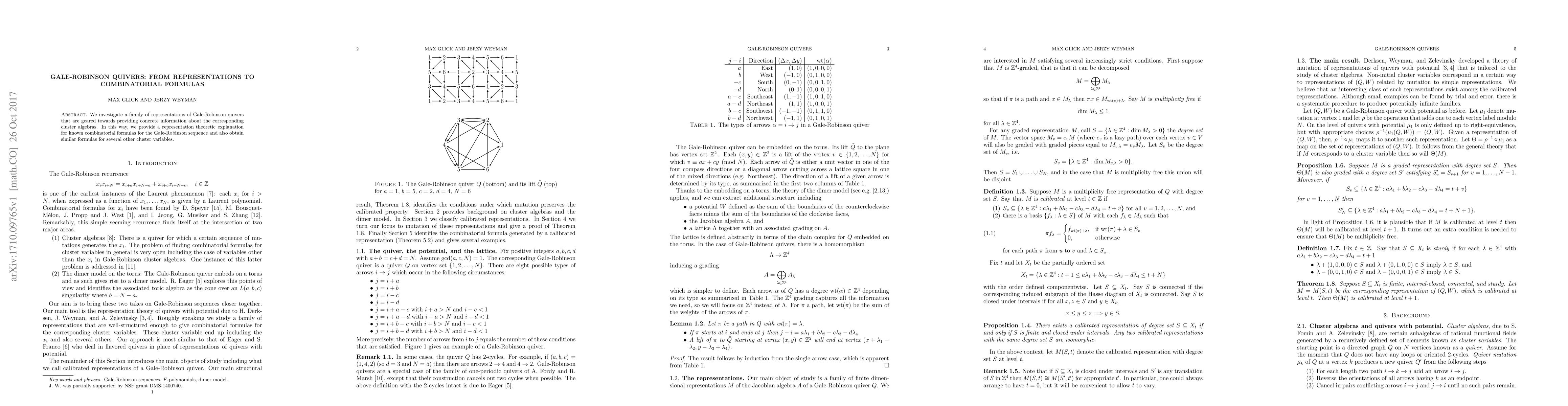 We investigate a family of representations of Gale-Robinson quivers that are geared towards providing concrete information about the corresponding cluster algebras. In this way, we provide a representation theoretic explanation for known combinatorial formulas for the Gale-Robinson sequence and also obtain similar formulas for several other cluster variables.