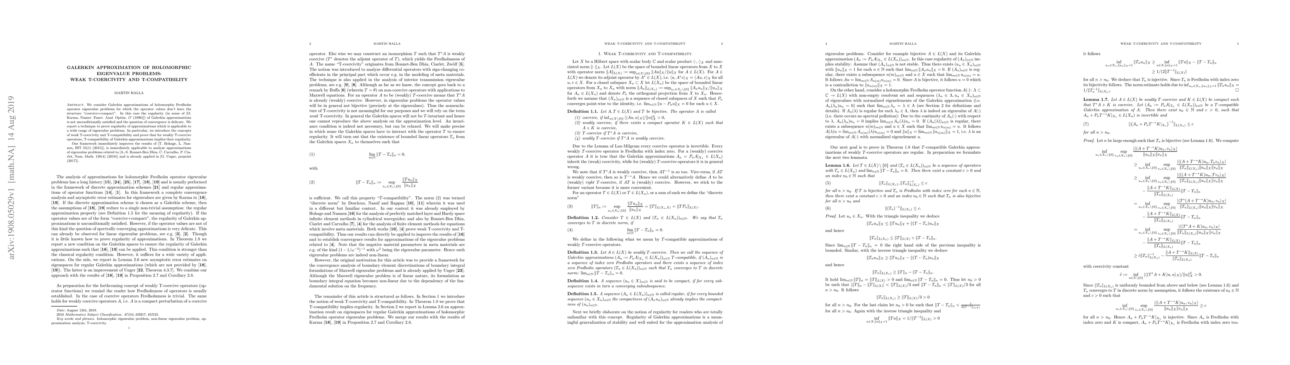 We consider Galerkin approximations of holomorphic Fredholm operator eigenvalue problems for which the operator values don't have the structure "coercive+compact". In this case the regularity (in sense of [O. Karma, Numer. Funct. Anal. Optim. 17 (1996)]) of Galerkin approximations is not unconditionally satisfied and the question of convergence is delicate. We report a technique to prove regularity of approximations which is applicable to a wide range of eigenvalue problems. In particular, we introduce the concepts of weak T-coercivity and T-compatibility and prove that for weakly T-coercive operators, T-compatibility of Galerkin approximations implies their regularity. Our framework immediately improves the results of [T. Hohage, L. Nannen, BIT 55(1) (2015)], is immediately applicable to analyze approximations of eigenvalue problems related to [A.-S. Bonnet-Ben Dhia, C. Carvalho, P. Ciarlet, Num. Math. 138(4) (2018)] and is already applied in [G. Unger, preprint (2017)].