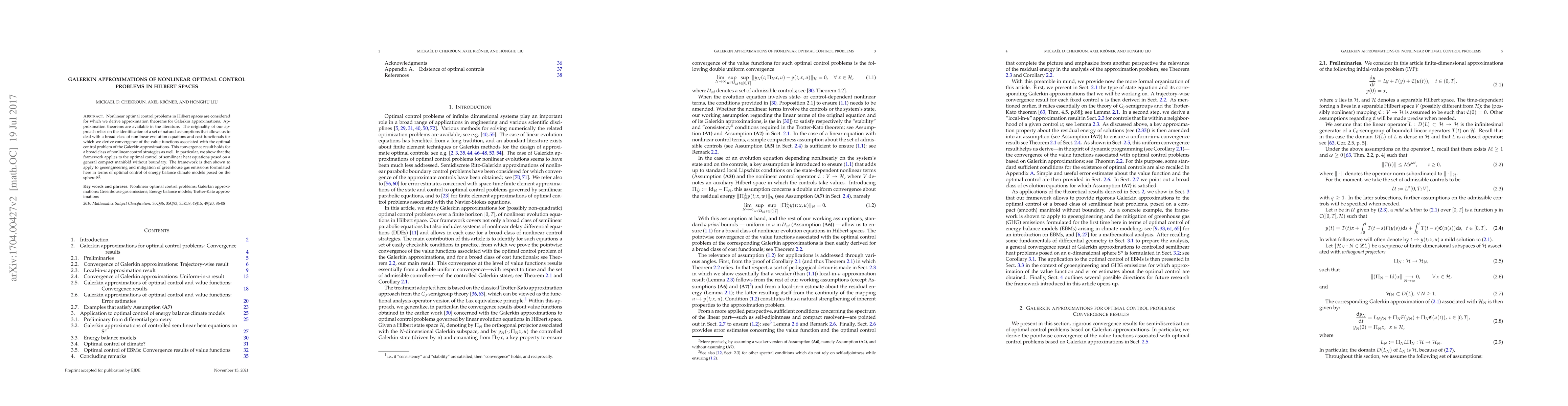 This paper develops approximation theorems for Galerkin methods applied to nonlinear optimal control problems in Hilbert spaces, identifying assumptions that allow convergence for a broad class of nonlinear evolution equations and cost functionals. The framework is demonstrated to effectively apply to semilinear heat equations and climate models for greenhouse gas emission mitigation.