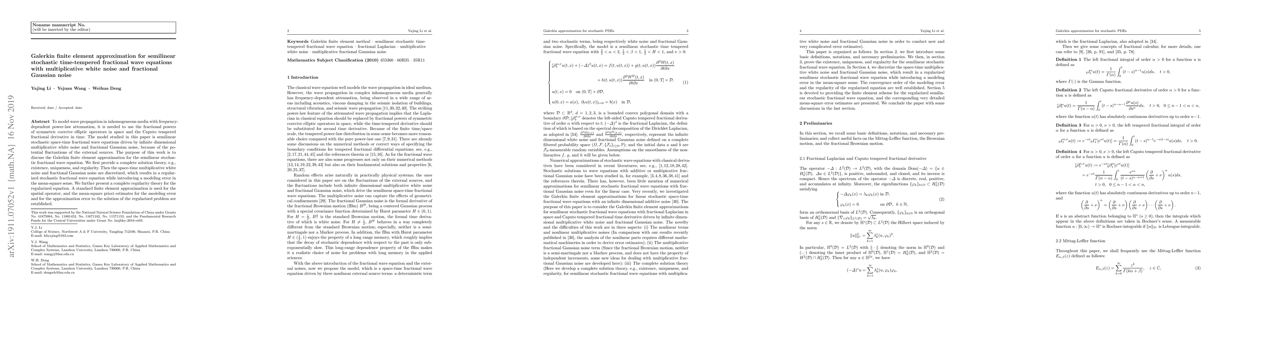 To model wave propagation in inhomogeneous media with frequency-dependent power-law attenuation, it is needed to use the fractional powers of symmetric coercive elliptic operators in space and the Caputo tempered fractional derivative in time. The model studied in this paper is semilinear stochastic space-time fractional wave equations driven by infinite dimensional multiplicative white noise and fractional Gaussian noise, because of the potential fluctuations of the external sources. The purpose of this work is to discuss the Galerkin finite element approximation for the semilinear stochastic fractional wave equation. We first provide a complete solution theory, e.g., existence, uniqueness, and regularity. Then the space-time multiplicative white noise and fractional Gaussian noise are discretized, which results in a regularized stochastic fractional wave equation while introducing a modeling error in the mean-square sense. We further present a complete regularity theory for the regularized equation. A standard finite element approximation is used for the spatial operator, and the mean-square priori estimates for the modeling error and for the approximation error to the solution of the regularized problem are established.