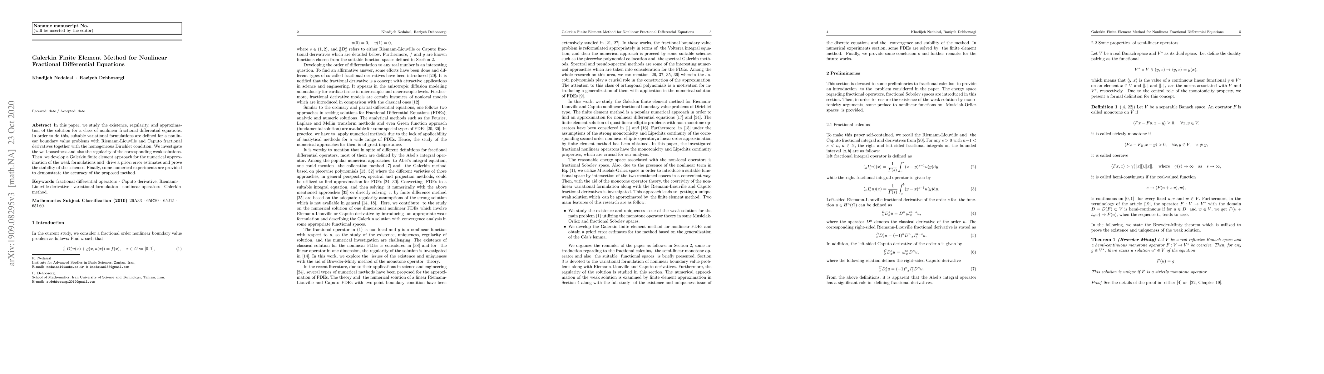 This paper explores the existence, regularity, and approximation of solutions for nonlinear fractional differential equations using the Galerkin finite element method. It defines variational formulations and investigates the well-posedness and regularity of weak solutions, followed by numerical approximation and a priori error estimates. Numerical experiments validate the method's accuracy.