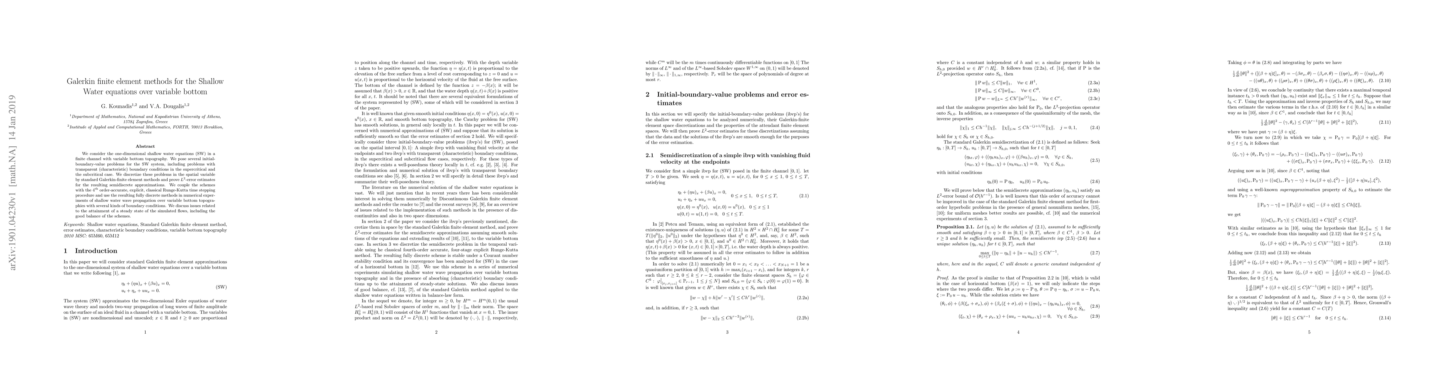 This paper develops Galerkin finite element methods for solving one-dimensional shallow water equations in channels with variable bottoms, providing L^2-error estimates and coupling with a 4th order Runge-Kutta time-stepping method. Numerical experiments demonstrate the method's effectiveness in simulating wave propagation under various boundary conditions.