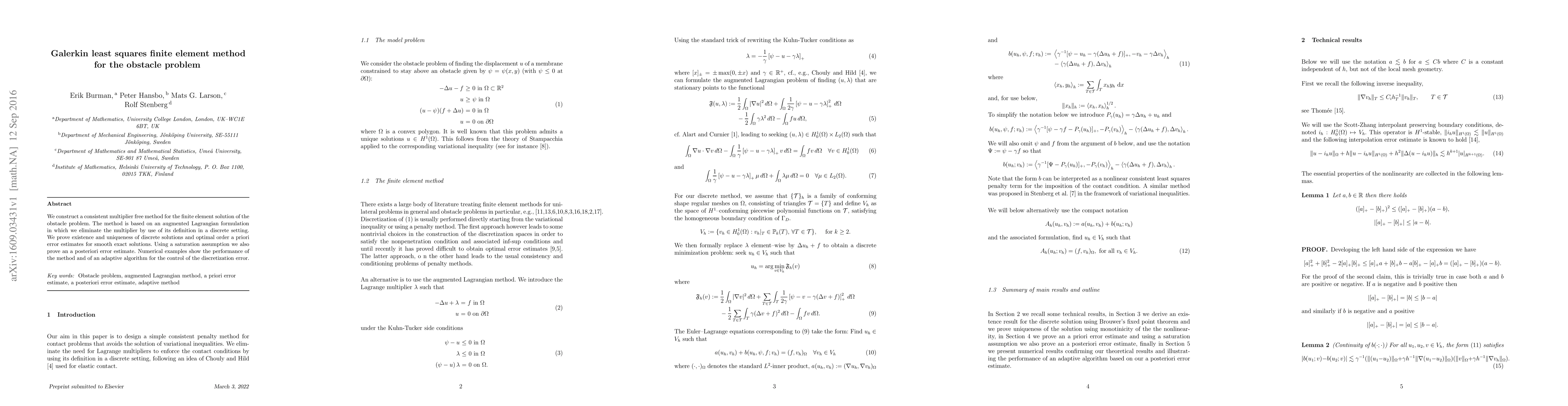 This paper proposes a Galerkin least squares finite element method for solving the obstacle problem, based on an augmented Lagrangian formulation. It proves existence, uniqueness, and optimal error estimates, and demonstrates the method's performance through numerical examples and an adaptive algorithm for error control.