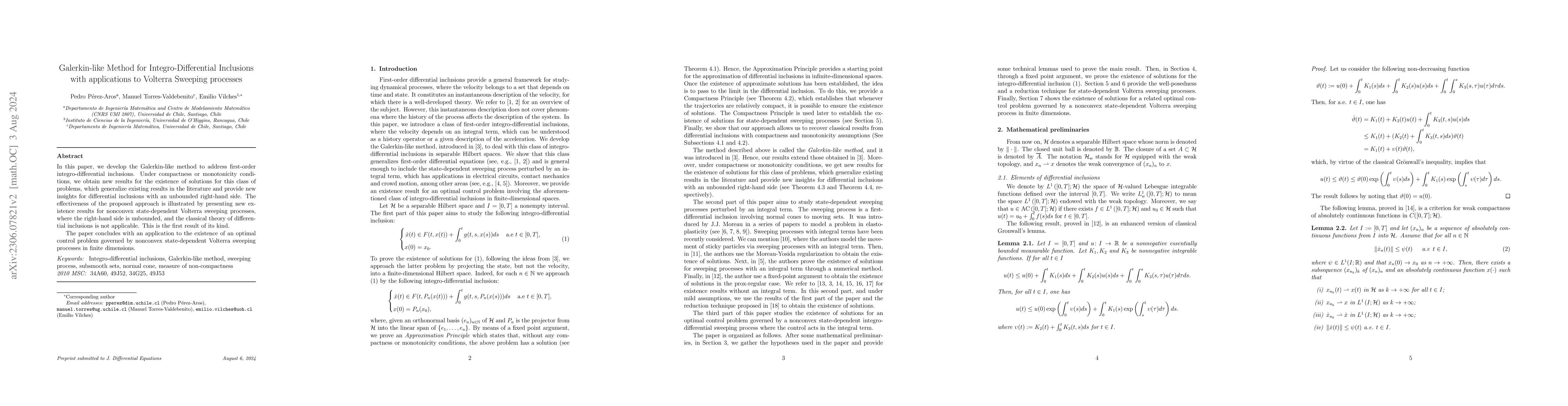 This paper introduces a Galerkin-like method for solving first-order integro-differential inclusions, proving existence results under compactness or monotonicity conditions. It extends existing theories and provides new insights for nonconvex state-dependent sweeping processes with unbounded right-hand sides.