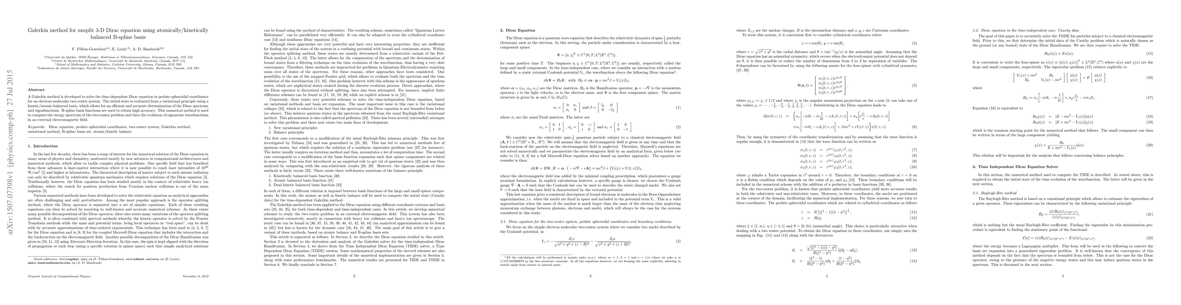 This paper develops a Galerkin method for solving the 3-D Dirac equation in prolate spheroidal coordinates using a balanced B-spline basis. The method accurately computes the energy spectrum and eigenfunctions for an electron-molecular two-center system, and simulates the evolution of eigenstate wavefunctions under external electromagnetic fields.