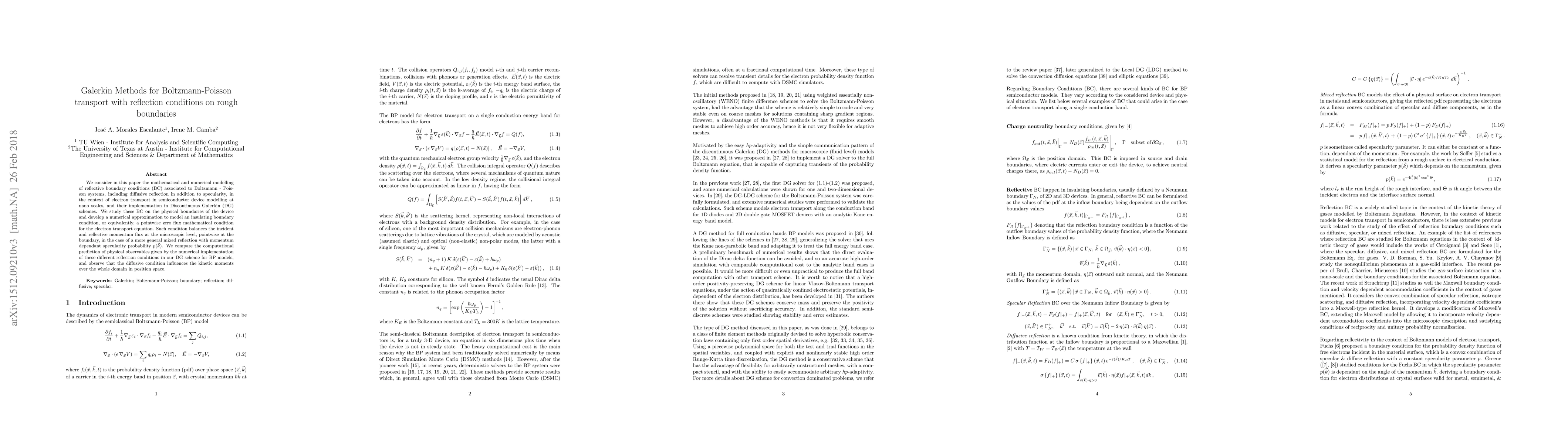 We consider in this paper the mathematical and numerical modelling of reflective boundary conditions (BC) associated to Boltzmann - Poisson systems, including diffusive reflection in addition to specularity, in the context of electron transport in semiconductor device modelling at nano scales, and their implementation in Discontinuous Galerkin (DG) schemes. We study these BC on the physical boundaries of the device and develop a numerical approximation to model an insulating boundary condition, or equivalently, a pointwise zero flux mathematical condition for the electron transport equation. Such condition balances the incident and reflective momentum flux at the microscopic level, pointwise at the boundary, in the case of a more general mixed reflection with momentum dependant specularity probability $p(\vec{k})$. We compare the computational prediction of physical observables given by the numerical implementation of these different reflection conditions in our DG scheme for BP models, and observe that the diffusive condition influences the kinetic moments over the whole domain in position space.