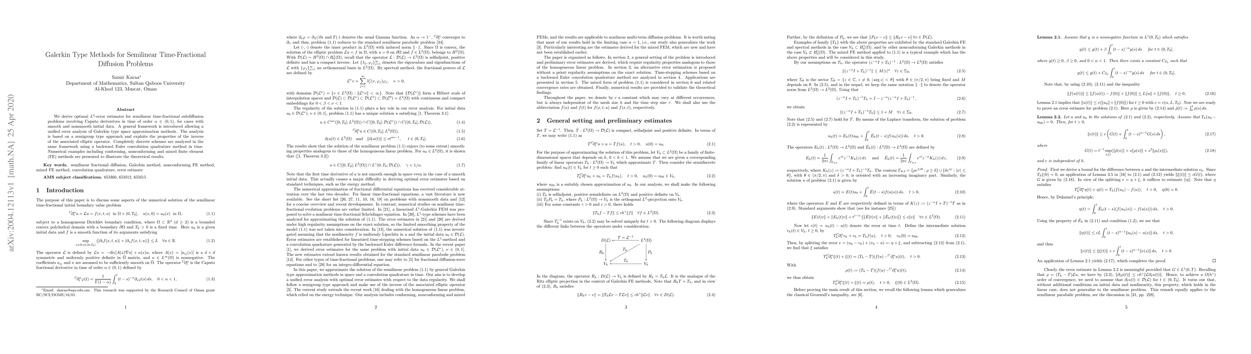 This paper introduces a unified framework for analyzing $L^2$-error estimates of Galerkin-type methods for semilinear time-fractional diffusion problems, providing optimal error bounds for smooth and nonsmooth initial data cases.
