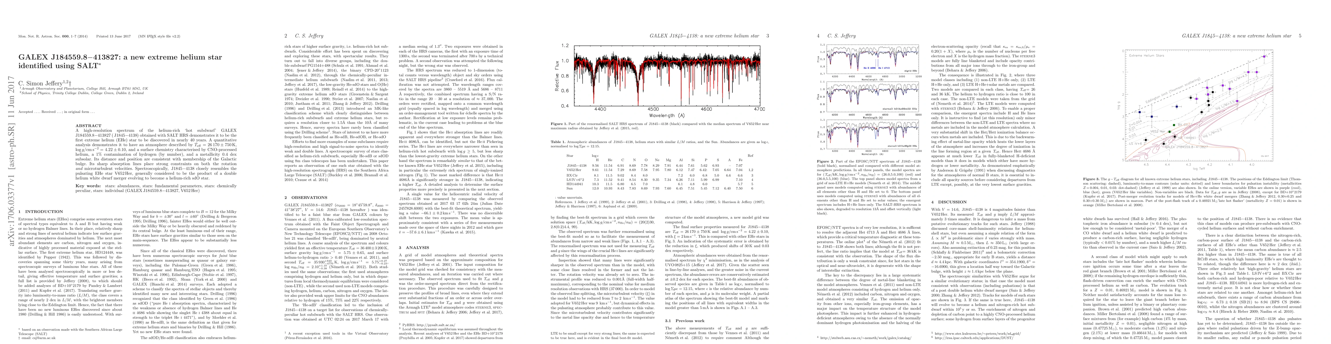 GALEX J184559.8-413827 is identified as the first extreme helium star discovered in nearly 40 years, characterized by a helium-rich atmosphere and a 1% hydrogen contamination, resembling the pulsating EHe star V652 Her. Its discovery was made using the Southern African Large Telescope's High Resolution Spectrograph.
