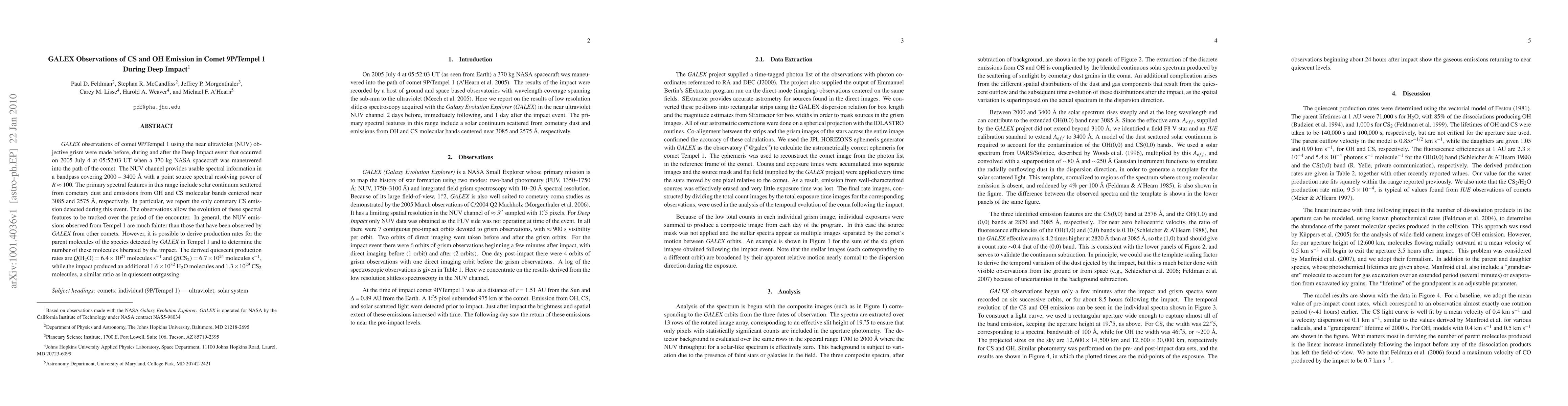 Scientists detected CS molecular emission in comet 9P/Tempel 1 for the first time after a NASA spacecraft impacted it in 2005. The observations provided insight into cometary gas production rates before and after the impact.