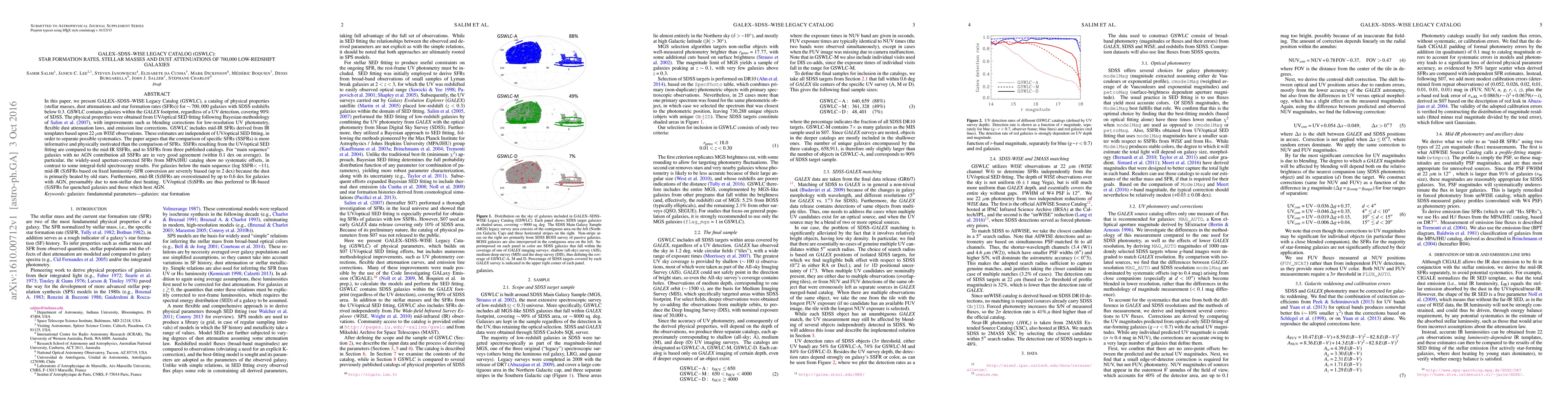 The paper introduces the GALEX-SDSS-WISE Legacy Catalog (GSWLC), detailing stellar masses, dust attenuations, and star formation rates (SFRs) for ~700,000 low-redshift galaxies. It emphasizes the use of UV/optical SED fitting and mid-IR SFRs from WISE, highlighting the preference for UV/optical SFRs over mid-IR SFRs for quenched galaxies and those with AGN.