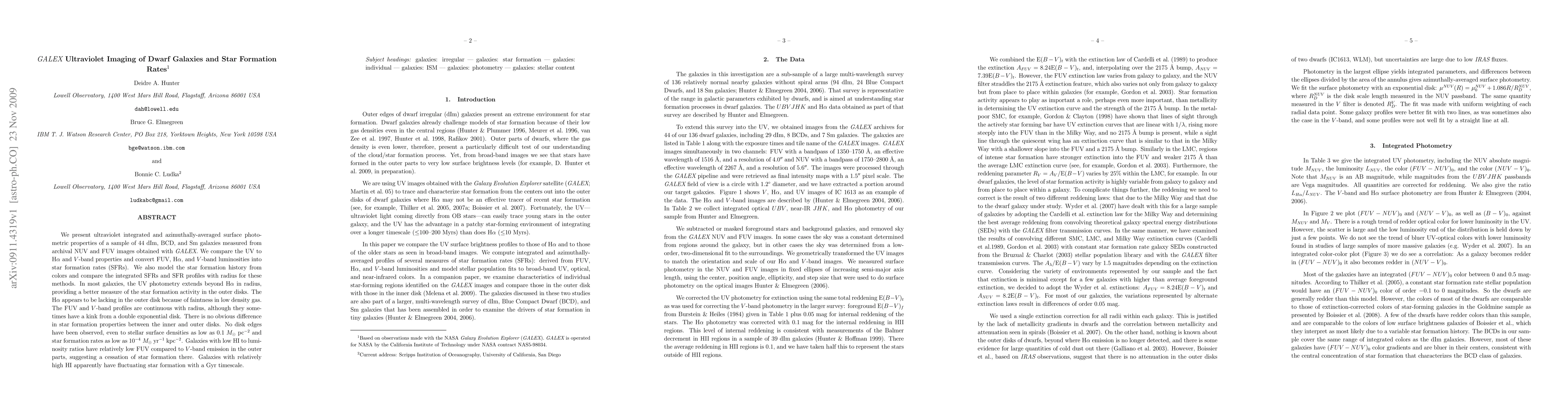 We present ultraviolet integrated and azimuthally-averaged surface photometric properties of a sample of 44 dIm, BCD, and Sm galaxies measured from archival NUV and FUV images obtained with GALEX. We compare the UV to Halpha and V-band properties and convert FUV, Halpha, and V-band luminosities into star formation rates (SFRs). We also model the star formation history from colors and compare the integrated SFRs and SFR profiles with radius for these methods. In most galaxies, the UV photometry extends beyond Halpha in radius, providing a better measure of the star formation activity in the outer disks. The Halpha appears to be lacking in the outer disk because of faintness in low density gas. The FUV and V-band profiles are continuous with radius, although they sometimes have a kink from a double exponential disk. There is no obvious difference in star formation properties between the inner and outer disks. No disk edges have been observed, even to stellar surface densities as low as 0.1 Msun/pc2 and star formation rates as low as 10^{-4} Msun/yr/kpc2. Galaxies with low HI to luminosity ratios have relatively low FUV compared to V-band emission in the outer parts, suggesting a cessation of star formation there. Galaxies with relatively high HI apparently have fluctuating star formation with a Gyr timescale.