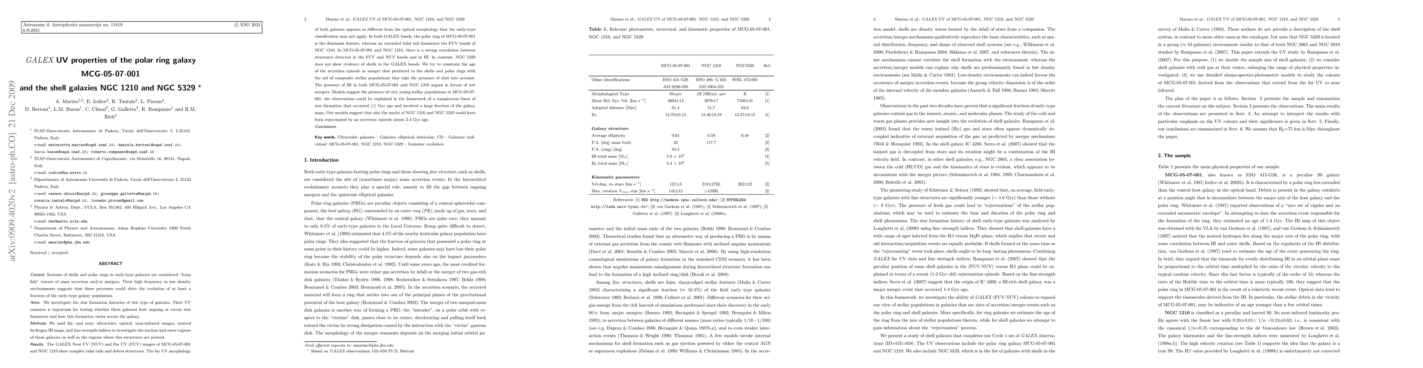 Researchers studied the ultraviolet properties of polar ring galaxy MCG-05-07-001 and shell galaxies NGC 1210 and NGC 5329 to test for recent star formation; they found evidence of young stellar populations in MCG-05-07-001 and possible rejuvenation in NGC 1210 and NGC 5329.