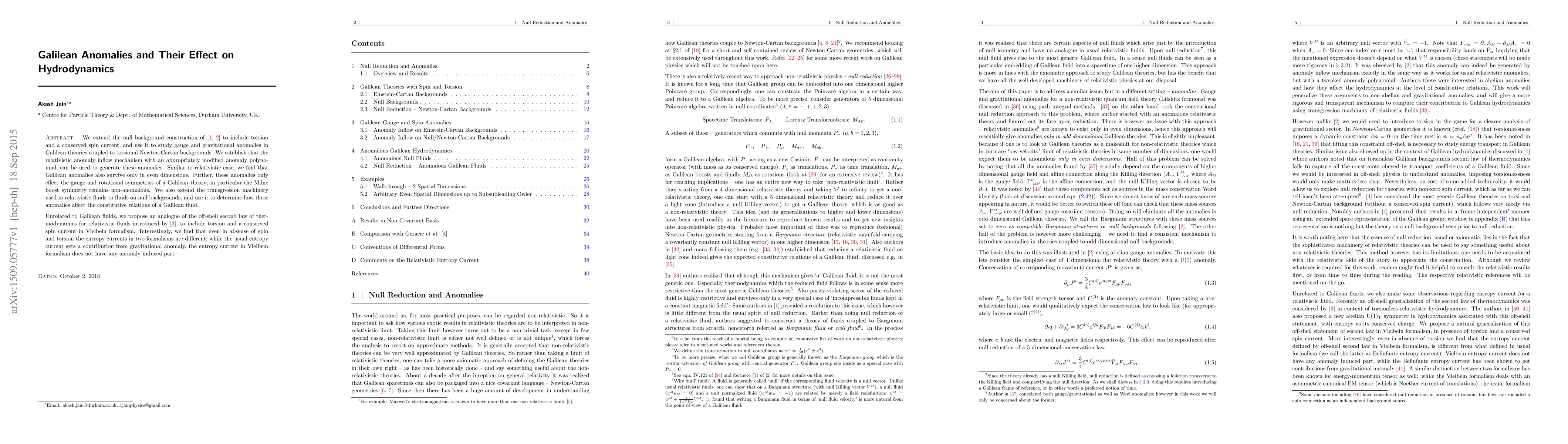 We extend the null background construction of [arXiv:1505.05677,arXiv:1509.04718] to include torsion and a conserved spin current, and use it to study gauge and gravitational anomalies in Galilean theories coupled to torsional Newton-Cartan backgrounds. We establish that the relativistic anomaly inflow mechanism with an appropriately modified anomaly polynomial, can be used to generate these anomalies. Similar to relativistic case, we find that Galilean anomalies also survive only in even dimensions. Further, these anomalies only effect the gauge and rotational symmetries of a Galilean theory; in particular the Milne boost symmetry remains non-anomalous. We also extend the transgression machinery used in relativistic fluids to fluids on null backgrounds, and use it to determine how these anomalies affect the constitutive relations of a Galilean fluid. Unrelated to Galilean fluids, we propose an analogue of the off-shell second law of thermodynamics for relativistic fluids introduced by [arXiv:1106.0277], to include torsion and a conserved spin current in Vielbein formalism. Interestingly, we find that even in absense of spin and torsion the entropy currents in two formalisms are different; while the usual entropy current gets a contribution from gravitational anomaly, the entropy current in Vielbein formalism does not have any anomaly induced part.