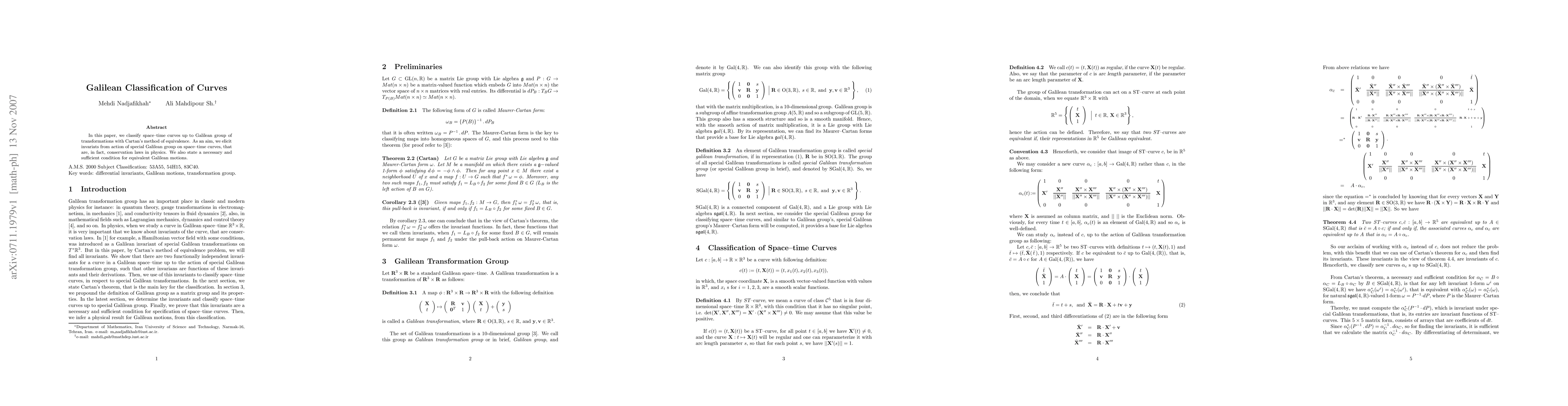 This paper classifies space-time curves under Galilean transformations using Cartan's method of equivalence, identifying invariants that correspond to conservation laws in physics. It also provides a necessary and sufficient condition for equivalent Galilean motions.