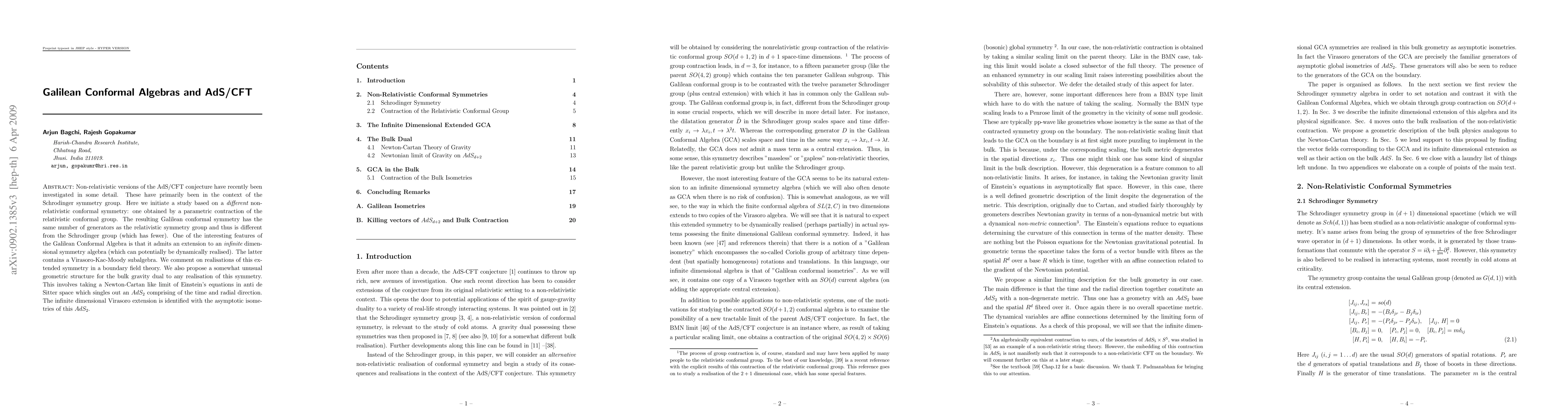 This paper explores non-relativistic versions of the AdS/CFT conjecture based on Galilean conformal symmetry, which offers an infinite-dimensional extension containing a Virasoro-Kac-Moody subalgebra, and proposes a geometric structure for the bulk gravity dual involving an $AdS_2$ limit.