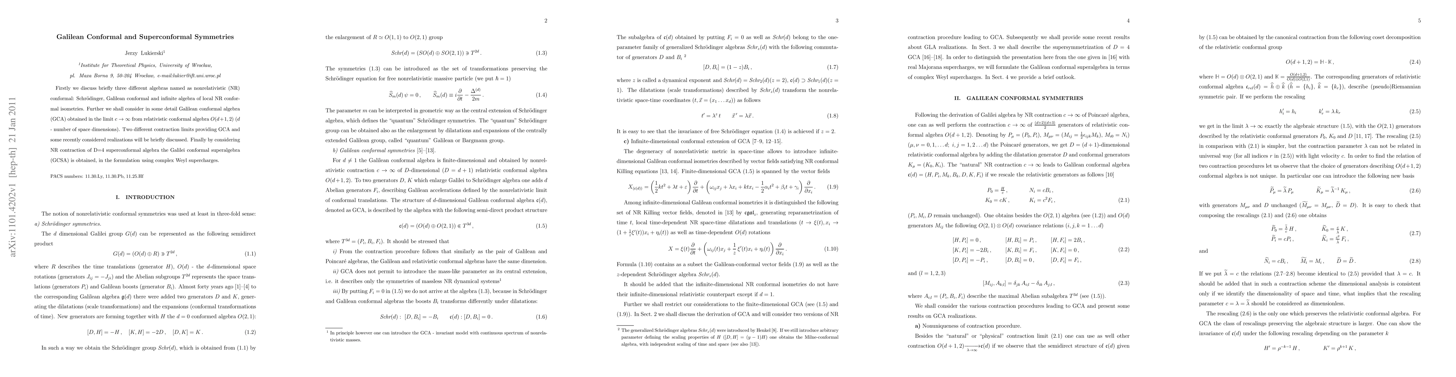 This paper explores the Galilean conformal algebra (GCA), derived from the relativistic conformal algebra by taking the speed of light to infinity, and discusses its realizations. It also introduces the Galilei conformal superalgebra (GCSA) by contracting the D=4 superconformal algebra, using complex Weyl supercharges.