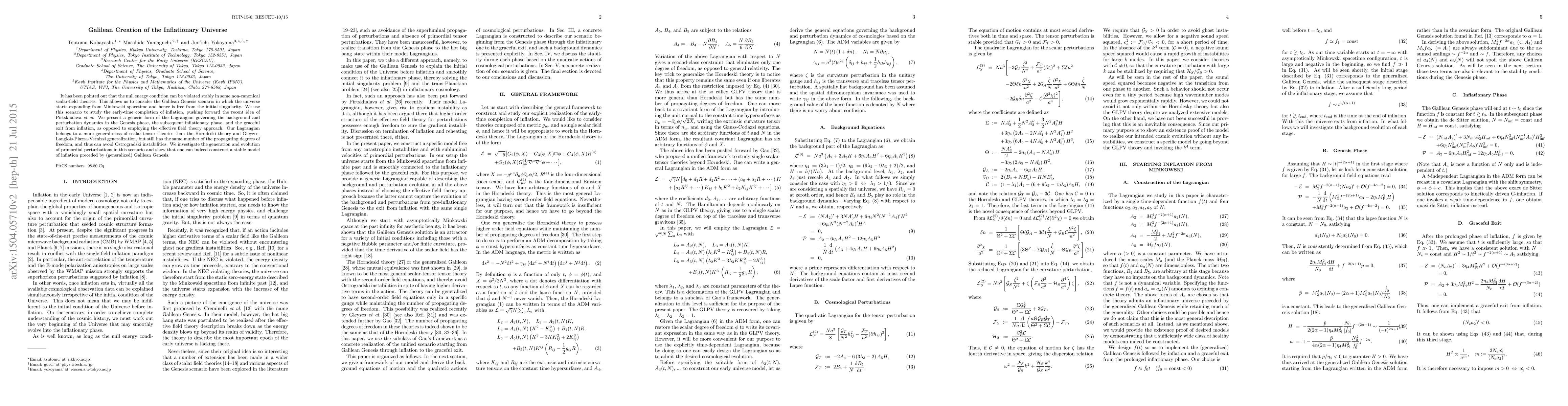 This research paper proposes a new scenario for the creation of the inflationary universe, known as Galilean Genesis, which avoids initial singularities and allows for stable models of inflation. It presents a generic form of the Lagrangian governing the early-time completion of inflation and primordial perturbations.