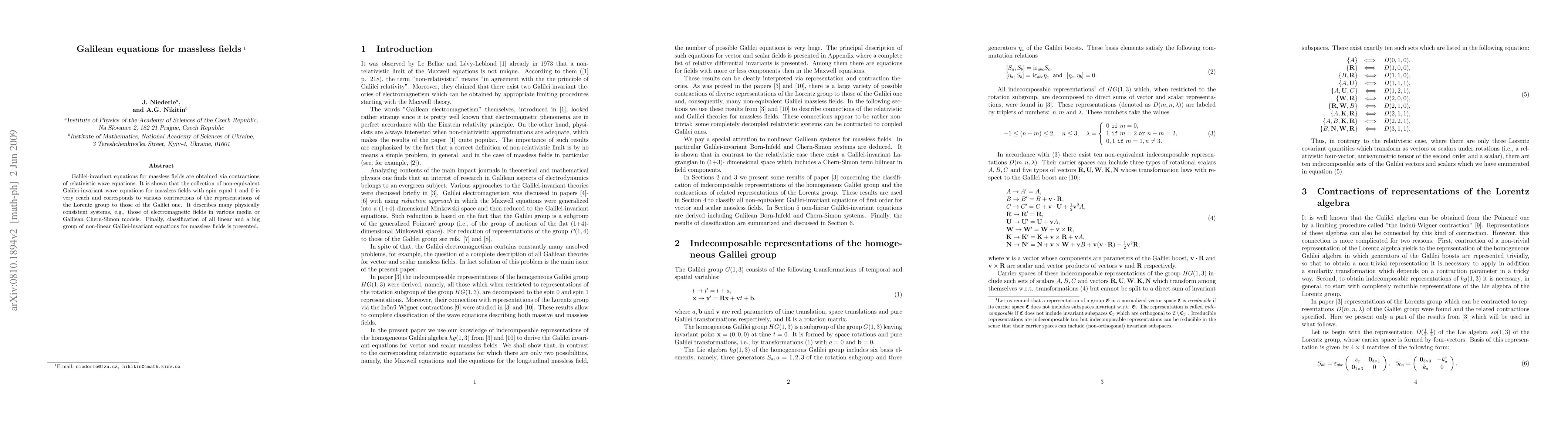 The paper presents a systematic classification and derivation of Galilei-invariant equations for massless fields, including both linear and nonlinear systems, via contractions of relativistic equations and reduction techniques.