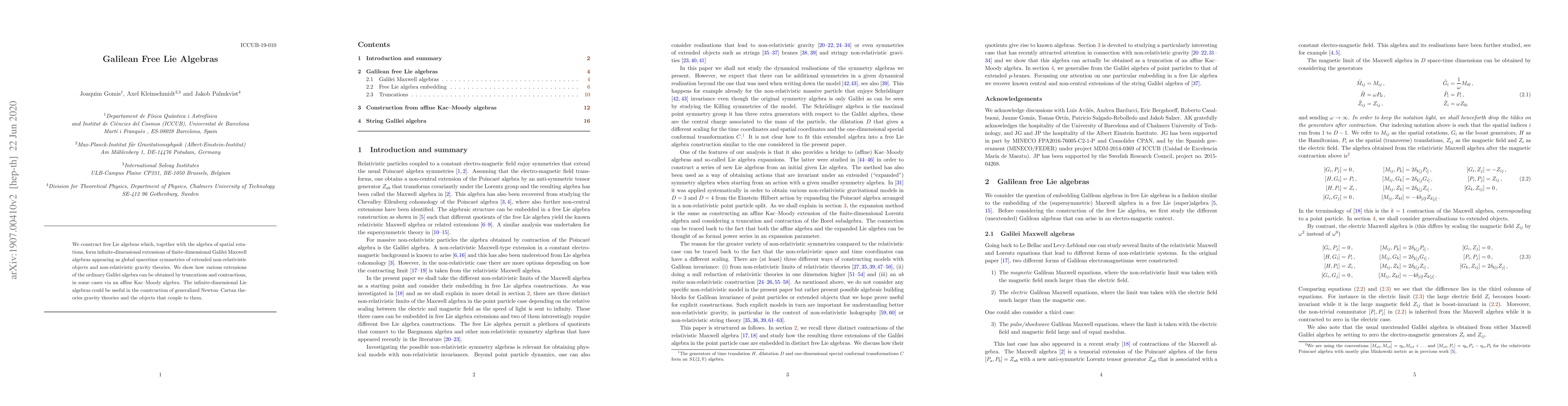 We construct free Lie algebras which, together with the algebra of spatial rotations, form infinite-dimensional extensions of finite-dimensional Galilei Maxwell algebras appearing as global spacetime symmetries of extended non-relativistic objects and non-relativistic gravity theories. We show how various extensions of the ordinary Galilei algebra can be obtained by truncations and contractions, in some cases via an affine Kac-Moody algebra. The infinite-dimensional Lie algebras could be useful in the construction of generalized Newton-Cartan theories gravity theories and the objects that couple to them.