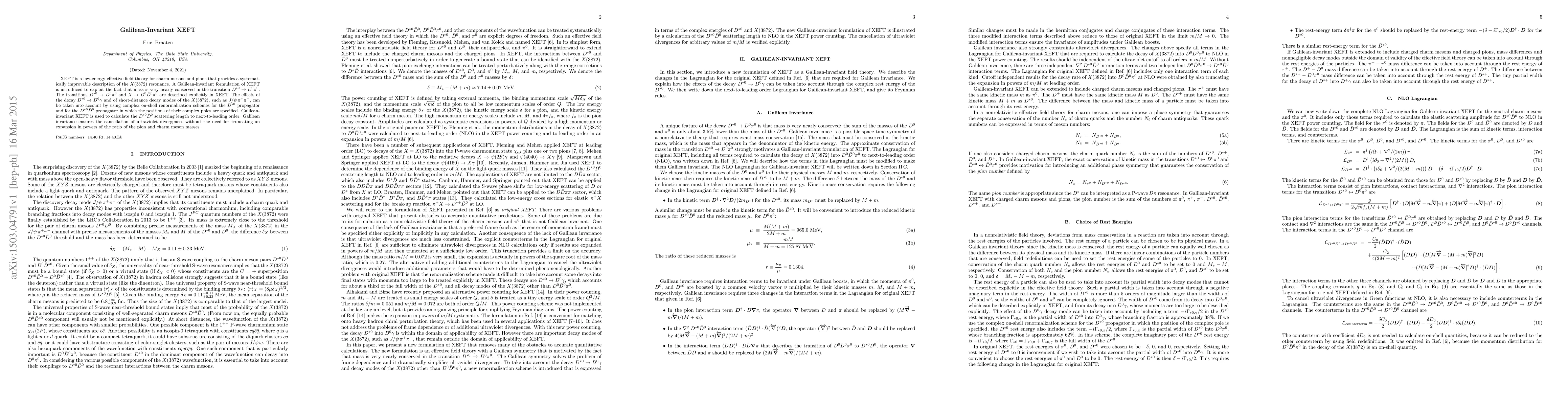 XEFT is a low-energy effective field theory for charm mesons and pions that provides a systematically improvable description of the X(3872) resonance. A Galilean-invariant formulation of XEFT is introduced to exploit the fact that mass is very nearly conserved in the transition D*0 --> D0 pi0. The transitions D*0 --> D0 pi0 and X --> D0 D0-bar pi0 are described explicitly in XEFT. The effects of the decay D*0 --> D0 gamma and of short-distance decay modes of the X(3872), such as J/psi --> pi+ pi-, can be taken into account by using complex on-shell renormalization schemes for the D*0 propagator and for the D*0 D0-bar propagator in which the positions of their complex poles are specified. Galilean-invariant XEFT is used to calculate the D*0 D0-bar scattering length to next-to-leading order. Galilean invariance ensures the cancellation of ultraviolet divergences without the need for truncating an expansion in powers of the ratio of the pion and charm meson masses.