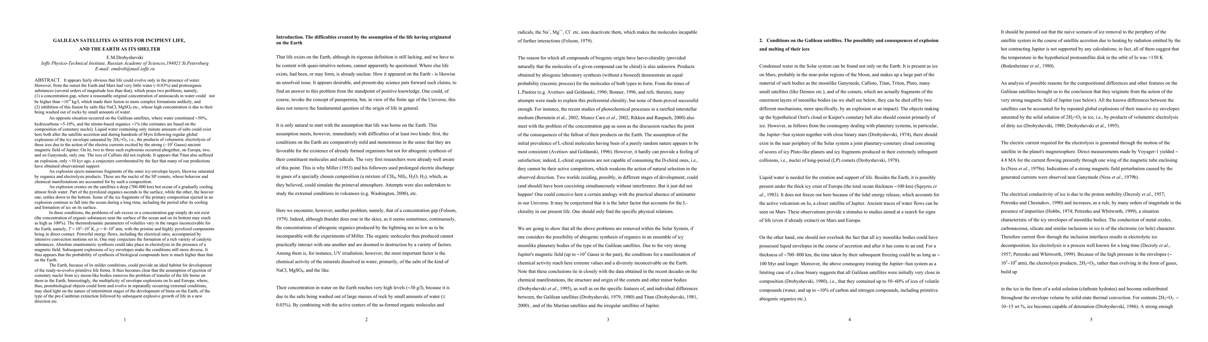 Summary: The paper posits that the Galilean satellites, lacking Earth's salt water and enriched with abiogenic organics, offer unique conditions conducive to the origin of life, facilitated by global electrochemical processes and magnetic field interactions, potentially leading to diverse environments and material exchanges. The Earth, in contrast, is suggested as a protective haven for this nascent life.