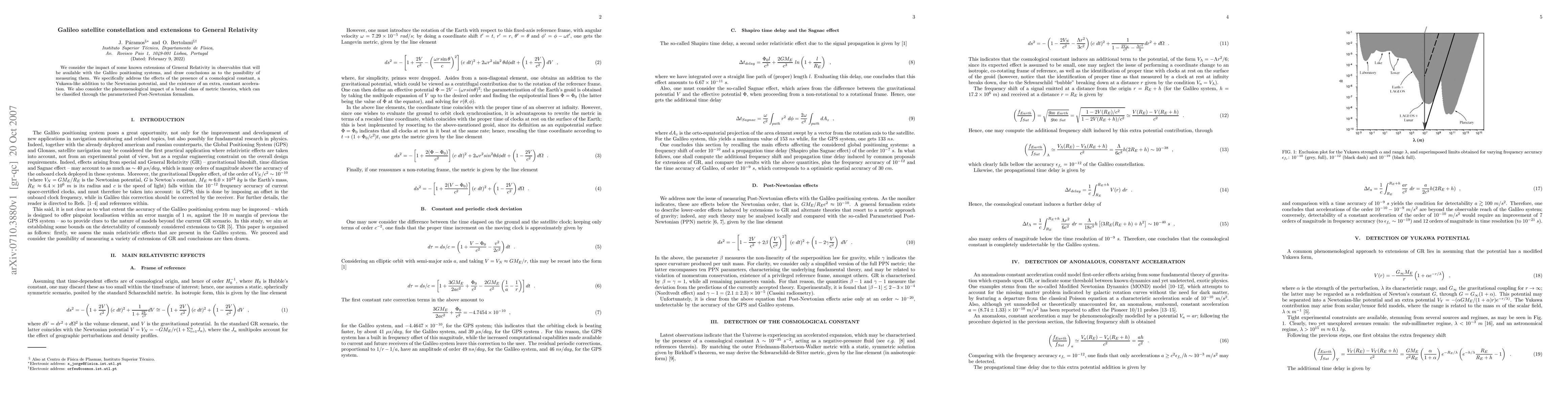 This paper investigates how extensions of General Relativity, including a cosmological constant, Yukawa-like modifications, and extra constant acceleration, could be measurable through the Galileo satellite constellation. It also examines the broader impact of various metric theories using the parameterized Post-Newtonian formalism.