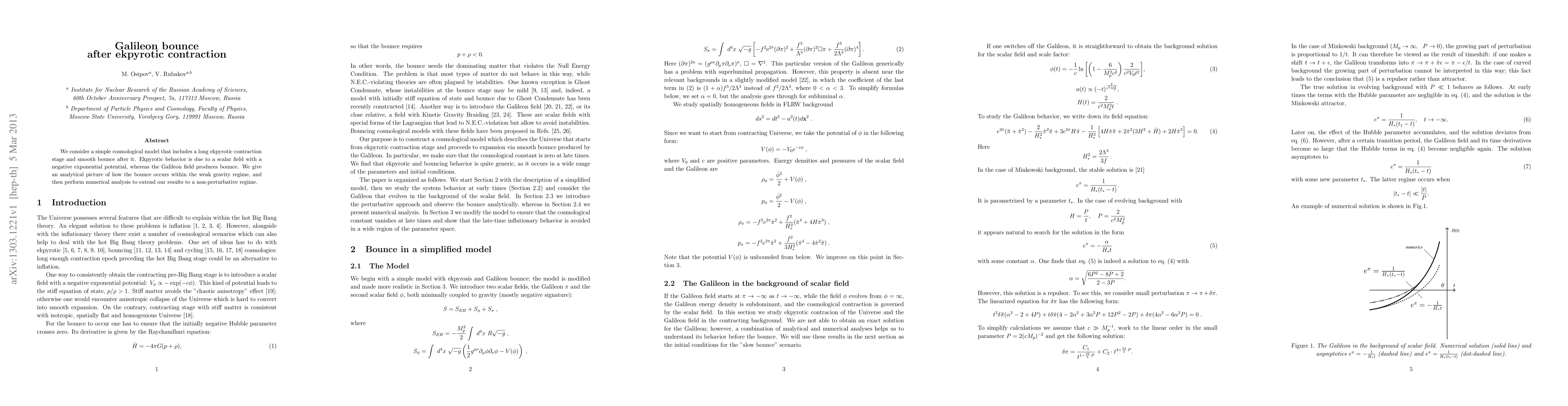 This research paper explores a cosmological model that includes an ekpyrotic contraction stage followed by a Galileon bounce, providing an analytical picture of the bounce's occurrence in the weak gravity regime and extending its results to a non-perturbative regime through numerical analysis.