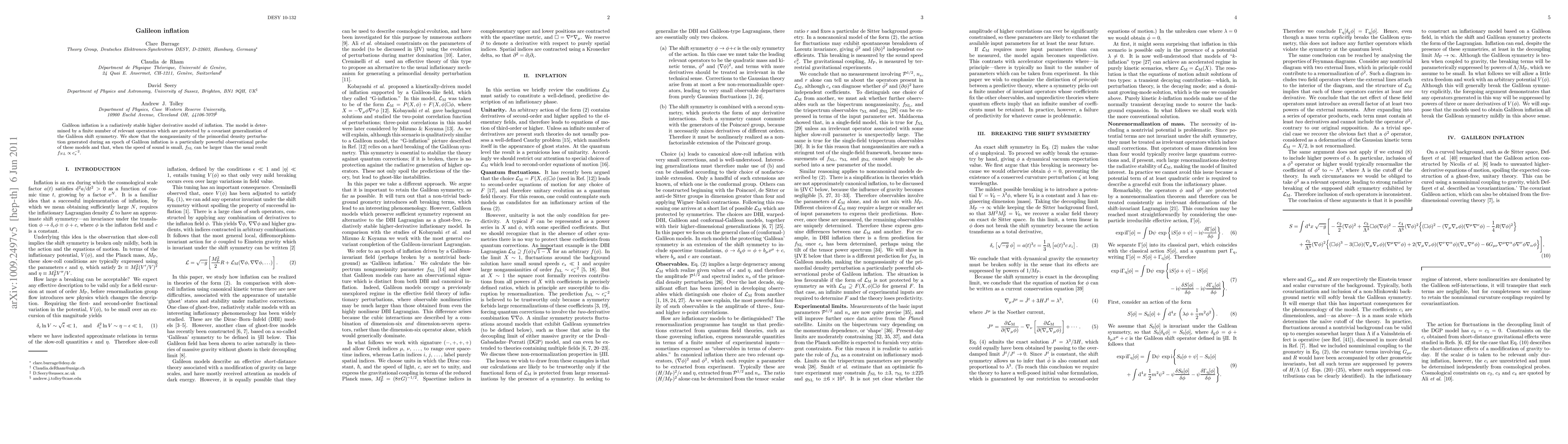 Galileon inflation utilizes higher derivative terms protected by a covariant Galileon symmetry, offering a stable inflationary framework. This model can generate significant nongaussianity in primordial density perturbations, with the non-linearity parameter fNL potentially exceeding typical values when the speed of sound is small.