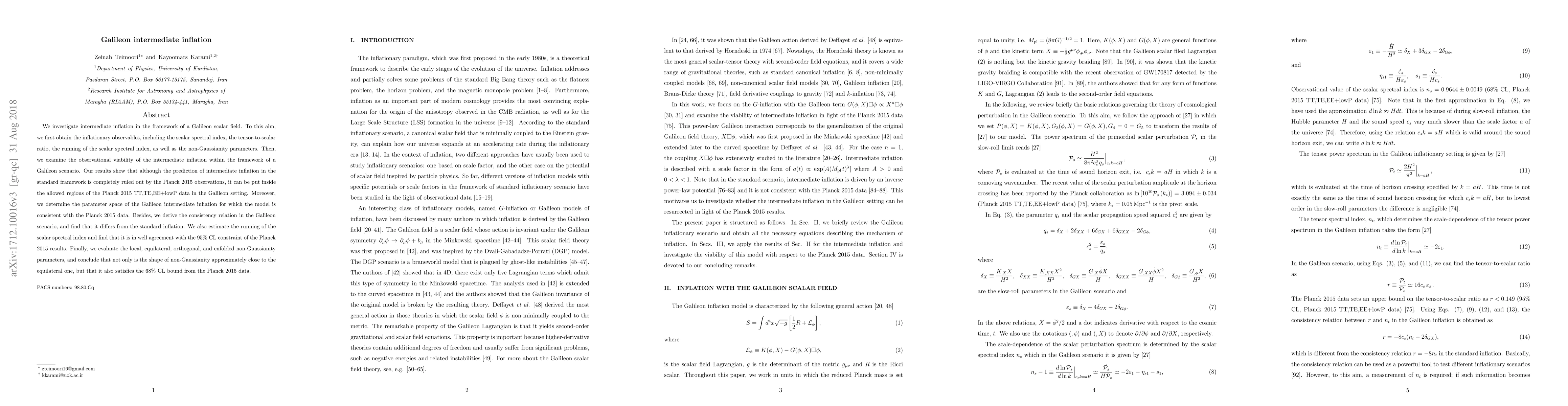 This paper explores intermediate inflation driven by a Galileon scalar field, deriving inflationary observables and determining its observational viability. It finds that the Galileon framework allows intermediate inflation to fit within the Planck 2015 data, differing from standard predictions, and satisfies constraints on non-Gaussianity.