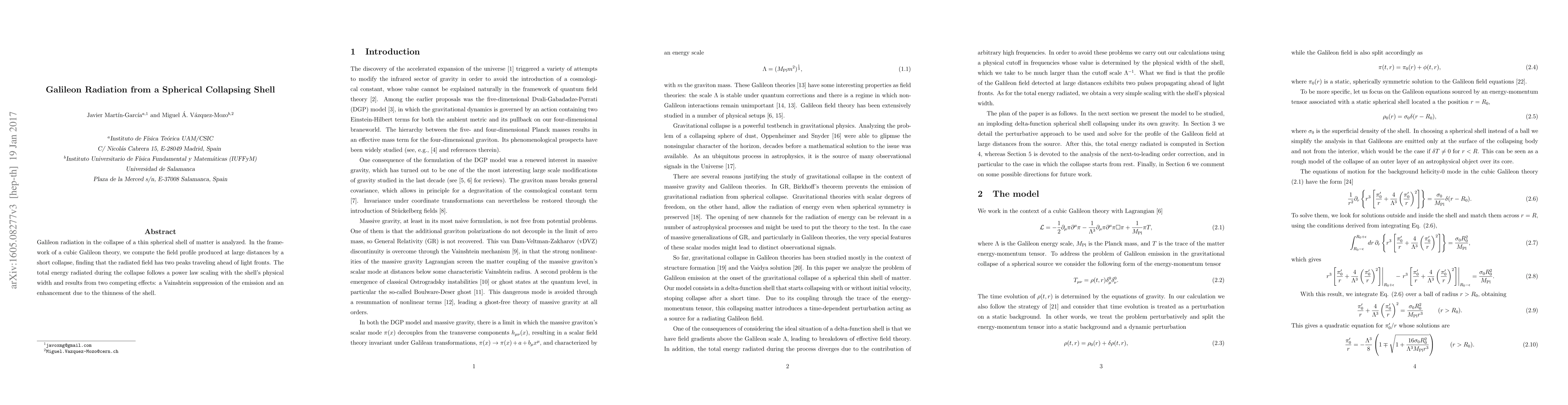 This paper investigates Galileon radiation from a collapsing spherical shell, revealing that the emitted field exhibits two peaks ahead of light, with total energy scaling as a power law dependent on the shell's width, influenced by both Vainshtein suppression and shell thinness.