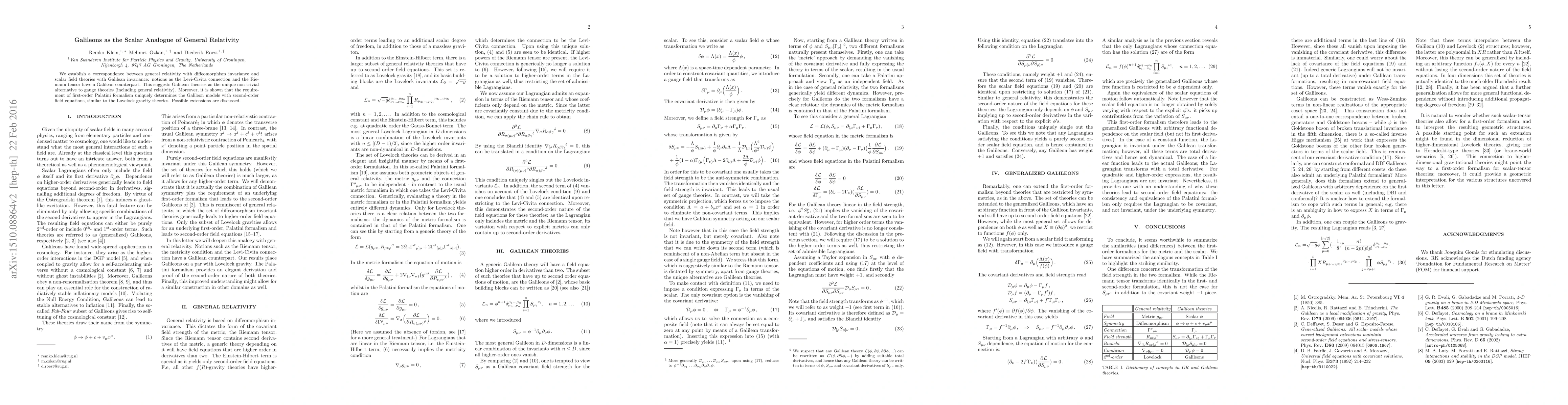 We establish a correspondence between general relativity with diffeomorphism invariance and scalar field theories with Galilean invariance: notions such as the Levi-Civita connection and the Riemann tensor have a Galilean counterpart. This suggests Galilean theories as the unique nontrivial alternative to gauge theories (including general relativity). Moreover, it is shown that the requirement of first-order Palatini formalism uniquely determines the Galileon models with second-order field equations, similar to the Lovelock gravity theories. Possible extensions are discussed.