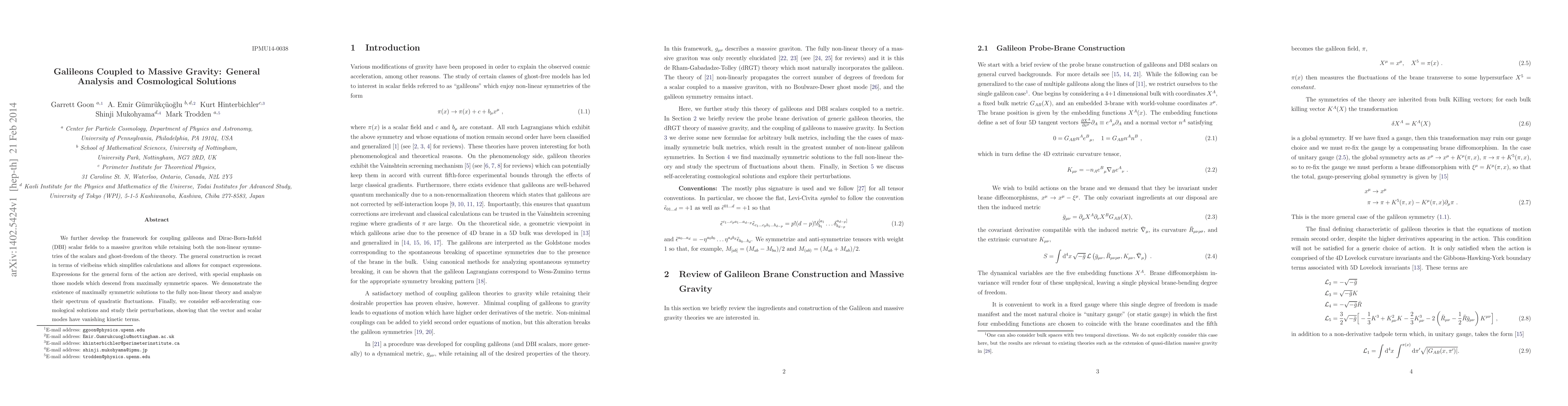 We further develop the framework for coupling galileons and Dirac-Born-Infeld (DBI) scalar fields to a massive graviton while retaining both the non-linear symmetries of the scalars and ghost-freedom of the theory. The general construction is recast in terms of vielbeins which simplifies calculations and allows for compact expressions. Expressions for the general form of the action are derived, with special emphasis on those models which descend from maximally symmetric spaces. We demonstrate the existence of maximally symmetric solutions to the fully non-linear theory and analyze their spectrum of quadratic fluctuations. Finally, we consider self-accelerating cosmological solutions and study their perturbations, showing that the vector and scalar modes have vanishing kinetic terms.