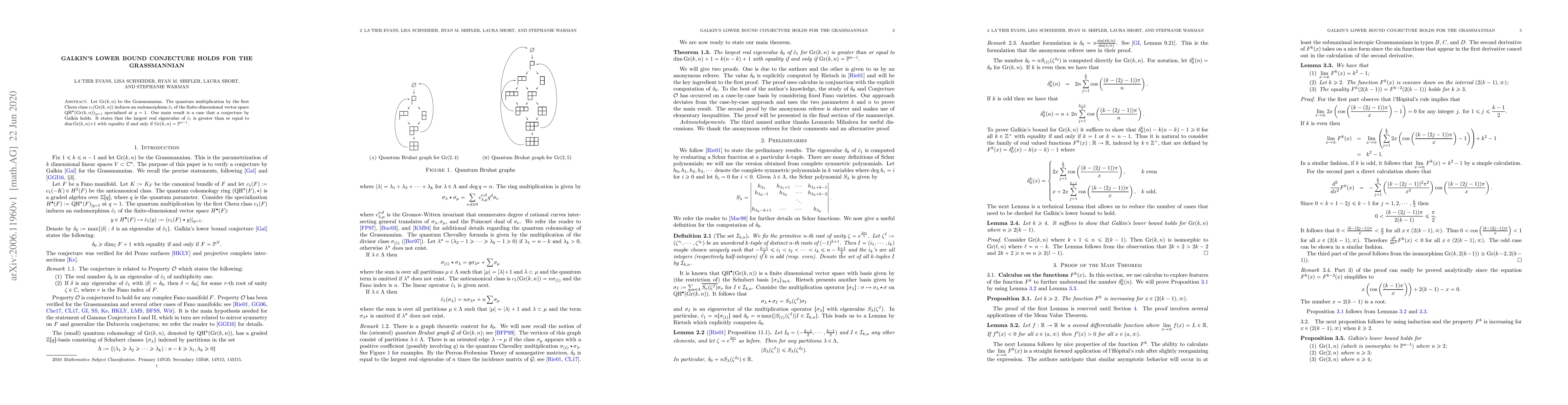 Summary: The paper confirms Galkin's conjecture for the Grassmannian, showing that the largest real eigenvalue of the quantum multiplication endomorphism induced by the first Chern class is greater than or equal to the Grassmannian's dimension plus one, with equality holding only for projective spaces.