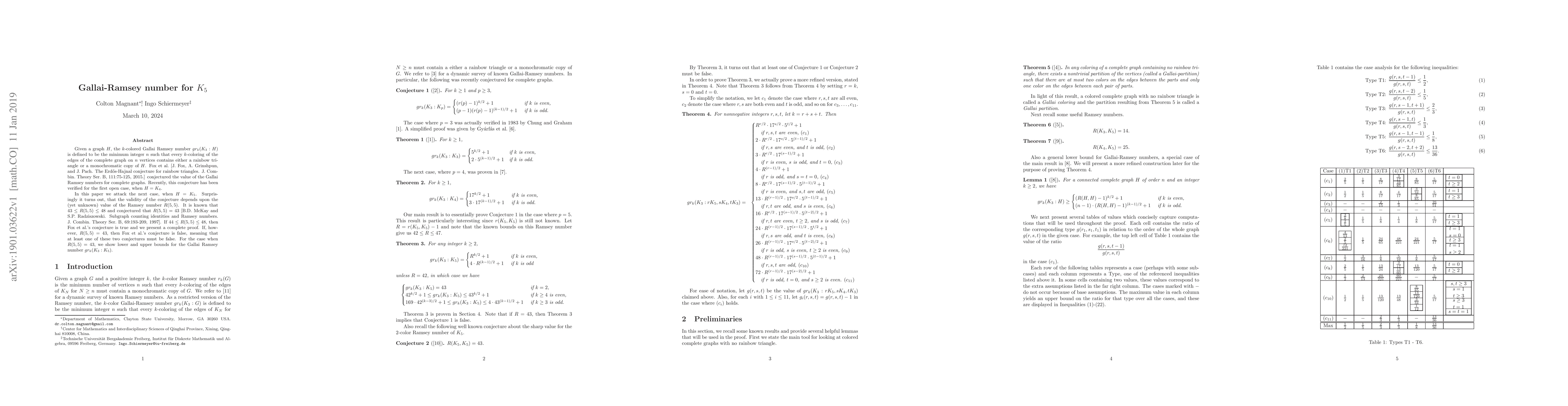 The paper investigates the Gallai-Ramsey number for K5, which is related to the validity of Fox et al.'s conjecture about rainbow triangles and monochromatic subgraphs. It depends on the value of R(5,5), where 43 ≤ R(5,5) ≤ 48.