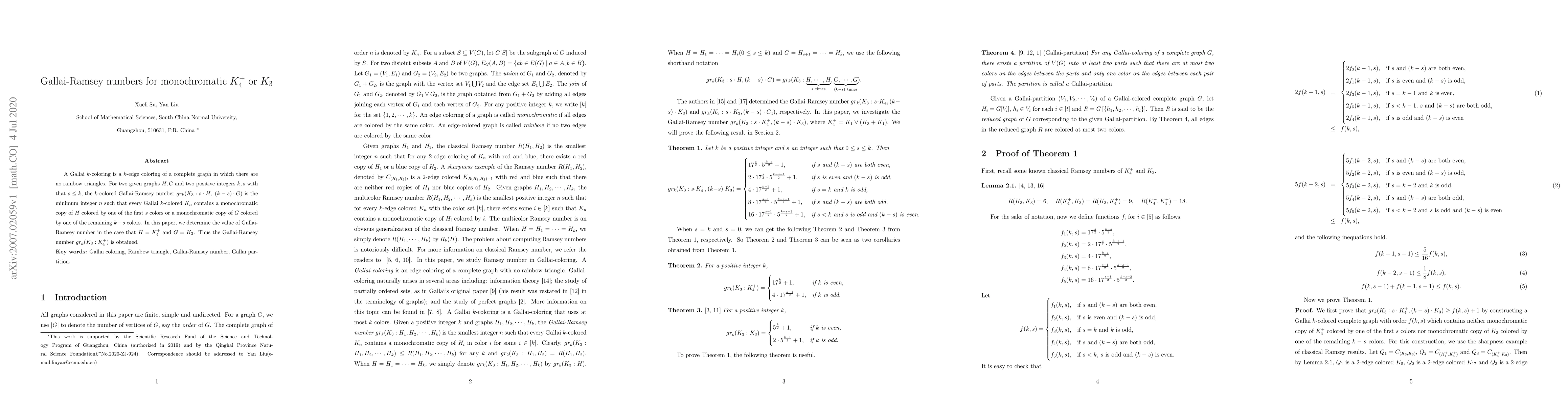 This paper determines the Gallai-Ramsey number for monochromatic K4+ or K3, finding a value for grk(K3: K42) that shows when a K3 graph is colored with k colors, a specific K4+ graph will appear if the coloring uses s colors.