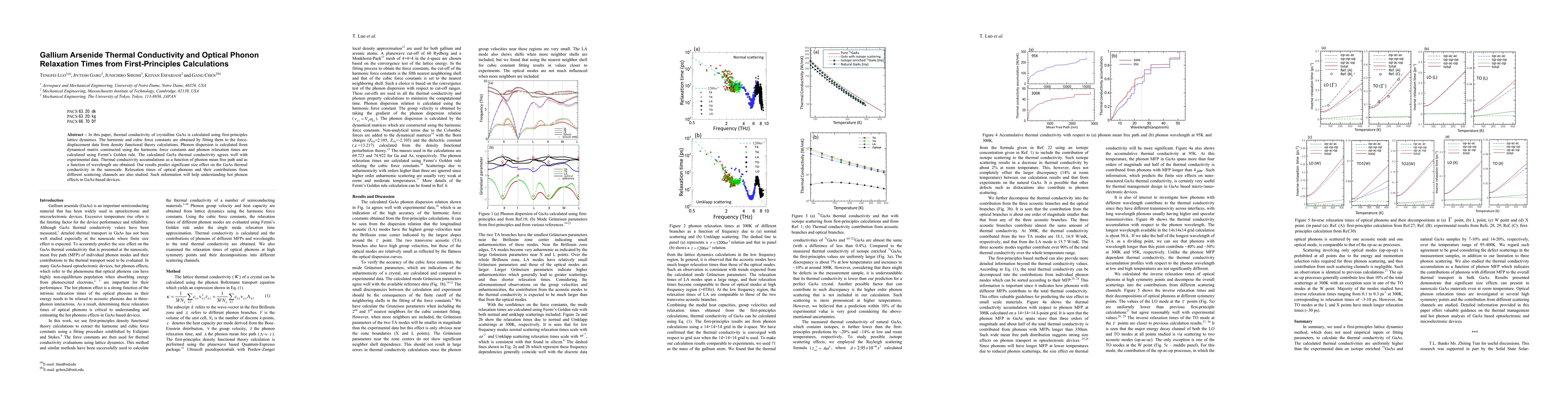This paper uses first-principles calculations to determine the thermal conductivity of crystalline gallium arsenide (GaAs), predicting significant nanoscale size effects and providing insights into optical phonon relaxation times, which are crucial for understanding hot phonon effects in GaAs-based devices. The results align well with experimental data.