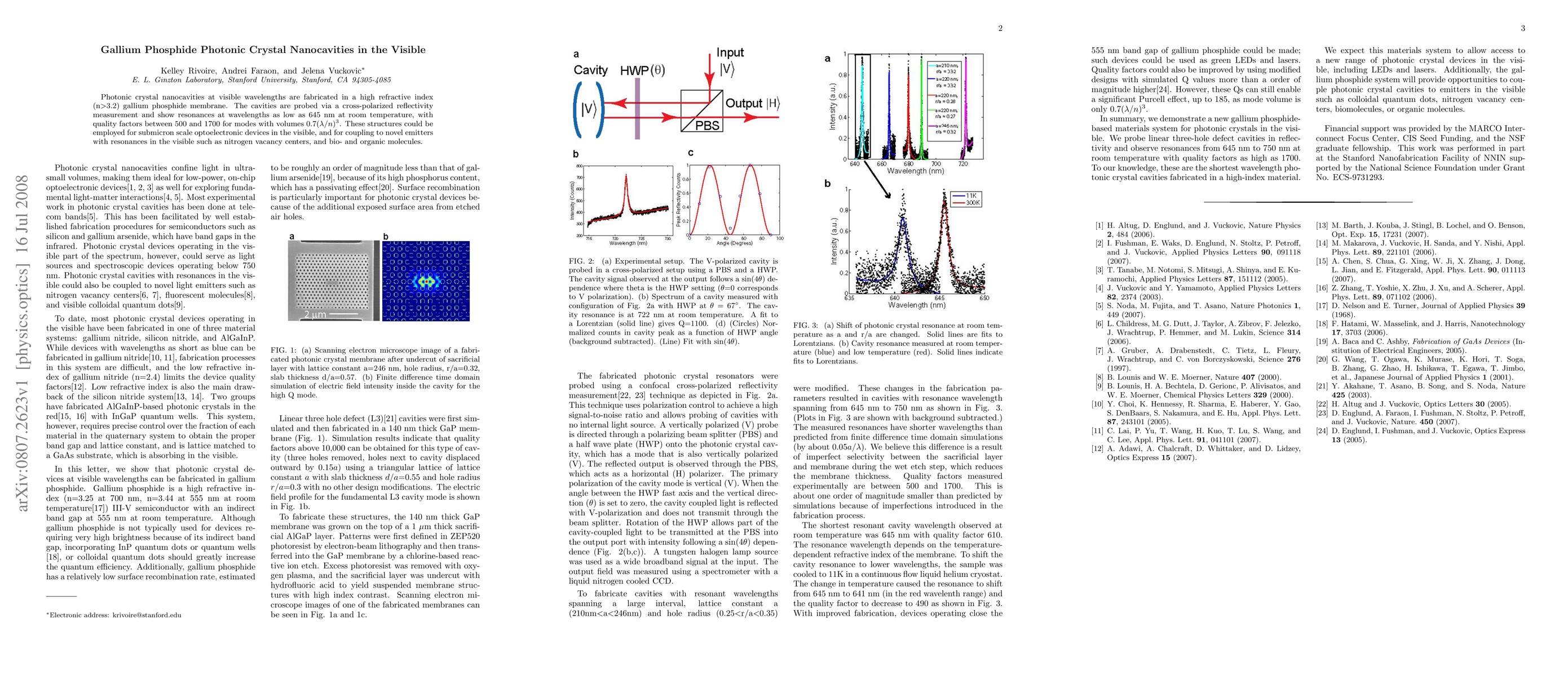 Gallium phosphide photonic crystal nanocavities exhibit resonances at visible wavelengths, achieving quality factors between 500 and 1700, potentially enabling submicron optoelectronic devices and coupling with visible-range emitters.